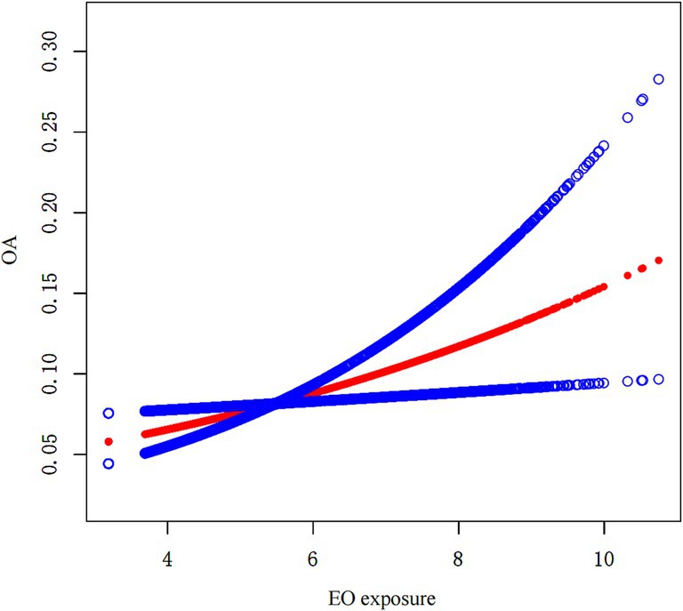 The pathogenesis of OA involves oxidative stress and inflammation (42, 43). Oxidative stress occurs when the formation of reactive oxygen species (ROS) exceeds the ability of the antioxidant defense system to remove them (44, 45). Oxidative stress is increased in OA chondrocytes and is a major cause of chronic inflammation (46–48). The levels of inflammatory mediators (such as IL-1β, TNF-α, and IL-6) are substantially elevated in OA joints, contributing to ROS generation (48). In other words, inflammation and oxidative stress are mutually dependent. They can activate signaling pathways in cartilage, generating phenotypic alterations marked by the failure of chondrocytes to maintain tissue homeostasis, thereby leading to OA (49–51). At present, the mechanism linking EO exposure to OA risk remains unknown. According to multiple studies, prolonged exposure to EO could result in diminished glutathione reductase activity and increased hepatic lipid peroxidation, both of which are linked to oxidative stress in vivo (52, 53). Chronic exposure to EO can also contribute to inflammatory lesions in rodent organs (54). EO exposure has been reported to be strongly linked to the onset of depressive symptoms, with inflammation serving as a crucial mediator (55). In addition, there is evidence that inflammation is involved in the occurrence of EO-associated periodontitis (56). Hence, it is plausible that increased EO exposure may increase OA risk via inflammation and oxidative stress.