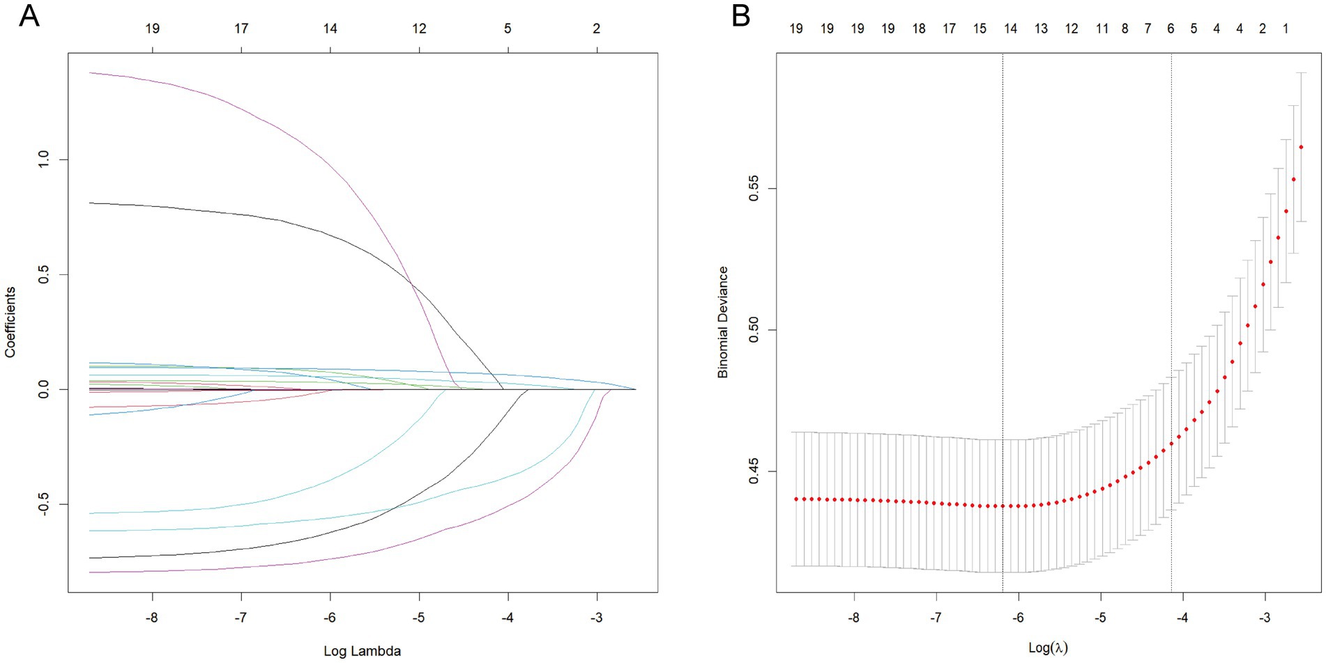 Figure 3. LASSO regression for related variables. (A) coefficient path plot. (B) cross-validation plot. The dashed lines on the left and right represent lambda.min and lambda.1se, respectively. We selected lambda.1se. The reason for choosing lambda.1se is that it leads to a more severe penalty and a lower number of variables than lambda.min does.