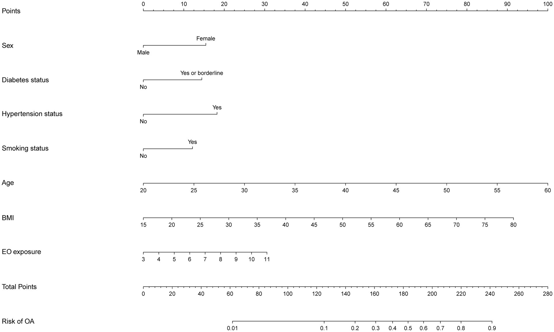 Conclusion: The findings of our research demonstrated that among middle-aged and young adults, EO exposure was positively associated with OA risk. A prediction model was developed by integrating EO exposure with other factors readily acquired from users to assist in the evaluation and management of high-risk OA groups.