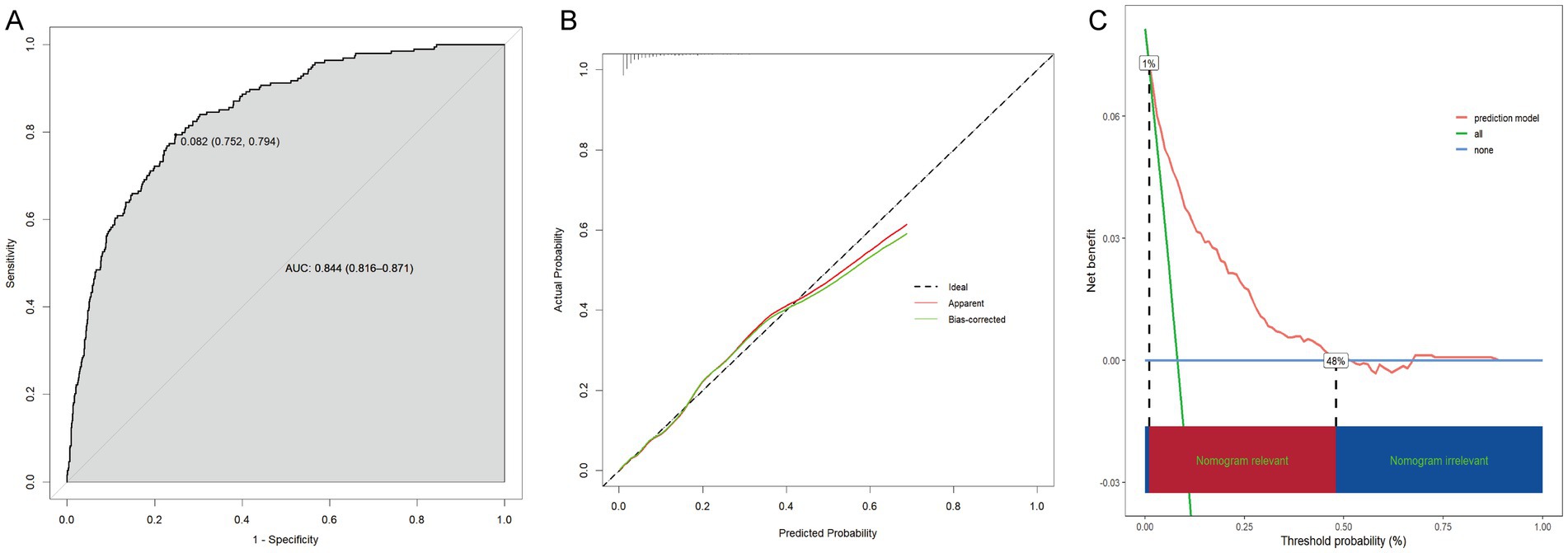 With an area under the ROC curve of 0.844 (95% CI: 0.816–0.871), the model clearly had good discriminatory power (Figure 5A). As illustrated in the calibration curve, the predicted probabilities were highly consistent with the actual probabilities, which indicates a high level of precision in the prediction model (Figure 5B). According to the DCA results, the prediction model was beneficial when the risk threshold was below 0.48 (Figure 5C).