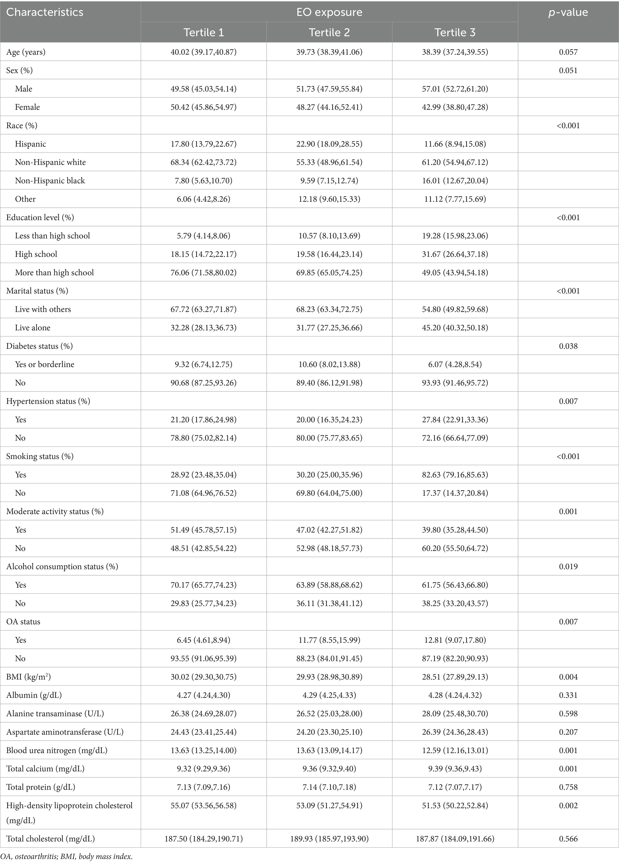The weighted demographic baseline characteristics of the study participants are depicted in Table 1. The participants were categorized into three groups according to the tertiles of EO exposure. Significant differences in race, education level, marital status, diabetes status, hypertension status, smoking status, moderate activity status, alcohol consumption status, OA status, BMI, blood urea nitrogen concentrations, total calcium concentrations, and high-density lipoprotein cholesterol concentrations (p < 0.05) were detected among the three groups.