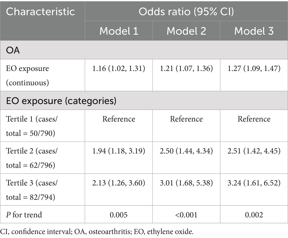 Citation: Wang X, Wang M, Guo Z and Xiang C (2025) Association between ethylene oxide exposure and osteoarthritis risk among middle-aged and young adults: a cross-sectional study. Front. Public Health. 13:1550456. doi: 10.3389/fpubh.2025.1550456