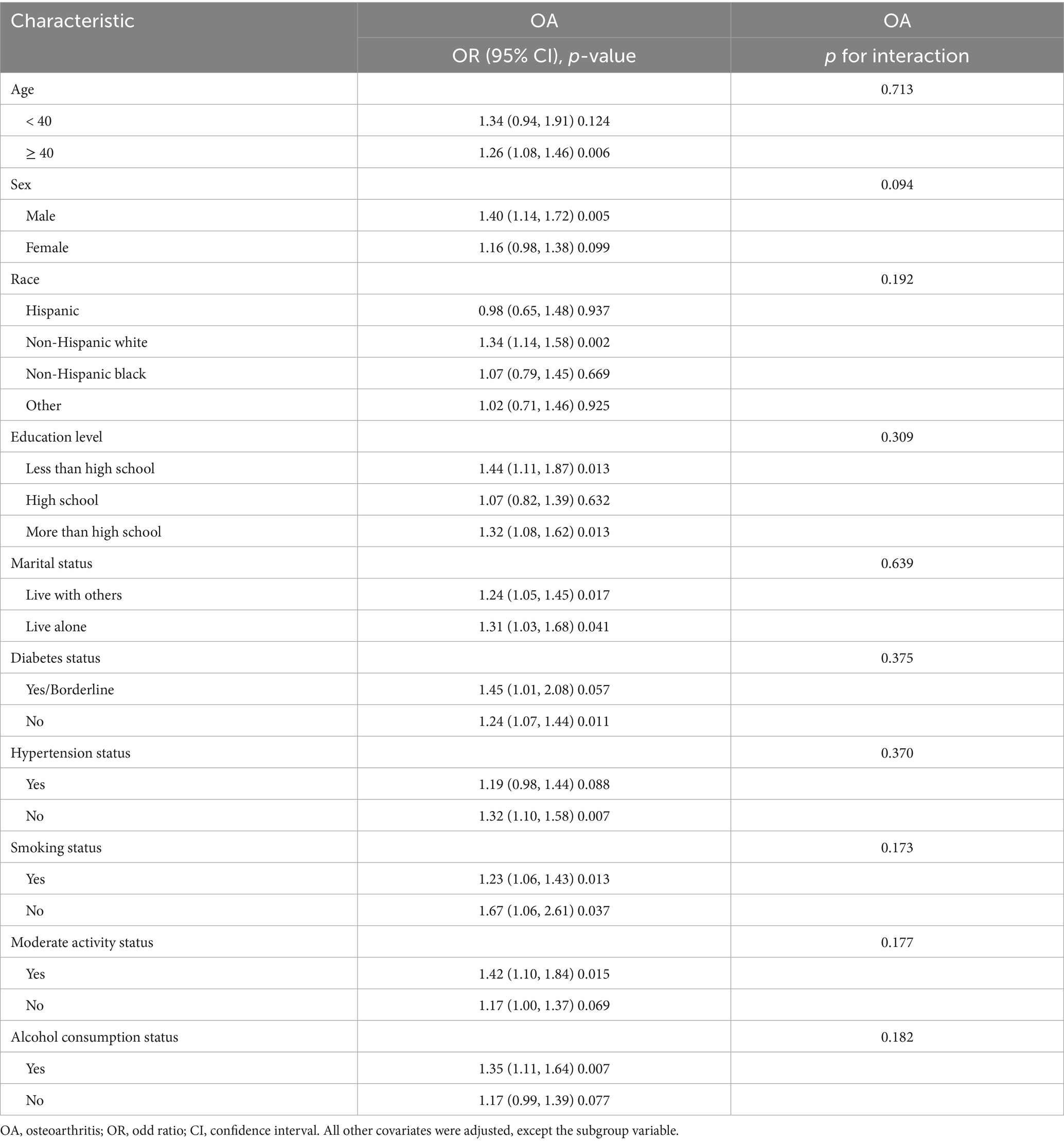 The results of the subgroup analysis and interaction tests are presented in Table 3. There was no statistically significant interaction observed in any of the subgroups (all p > 0.05), suggesting that the positive association between EO exposure and OA risk remained strong and consistent across different subpopulations.