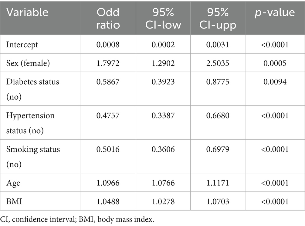 The prediction model initially considered candidate predictors that included indicators from the baseline characteristics in addition to EO exposure. Six key variables, including sex, diabetes status, hypertension status, smoking status, age, and BMI were selected through LASSO regression (Figure 3). The six selected variables were subsequently included in multivariable regression analysis to further screen the variables. The variables in that analysis with p values less than 0.05 were included in the prediction model (Table 4).