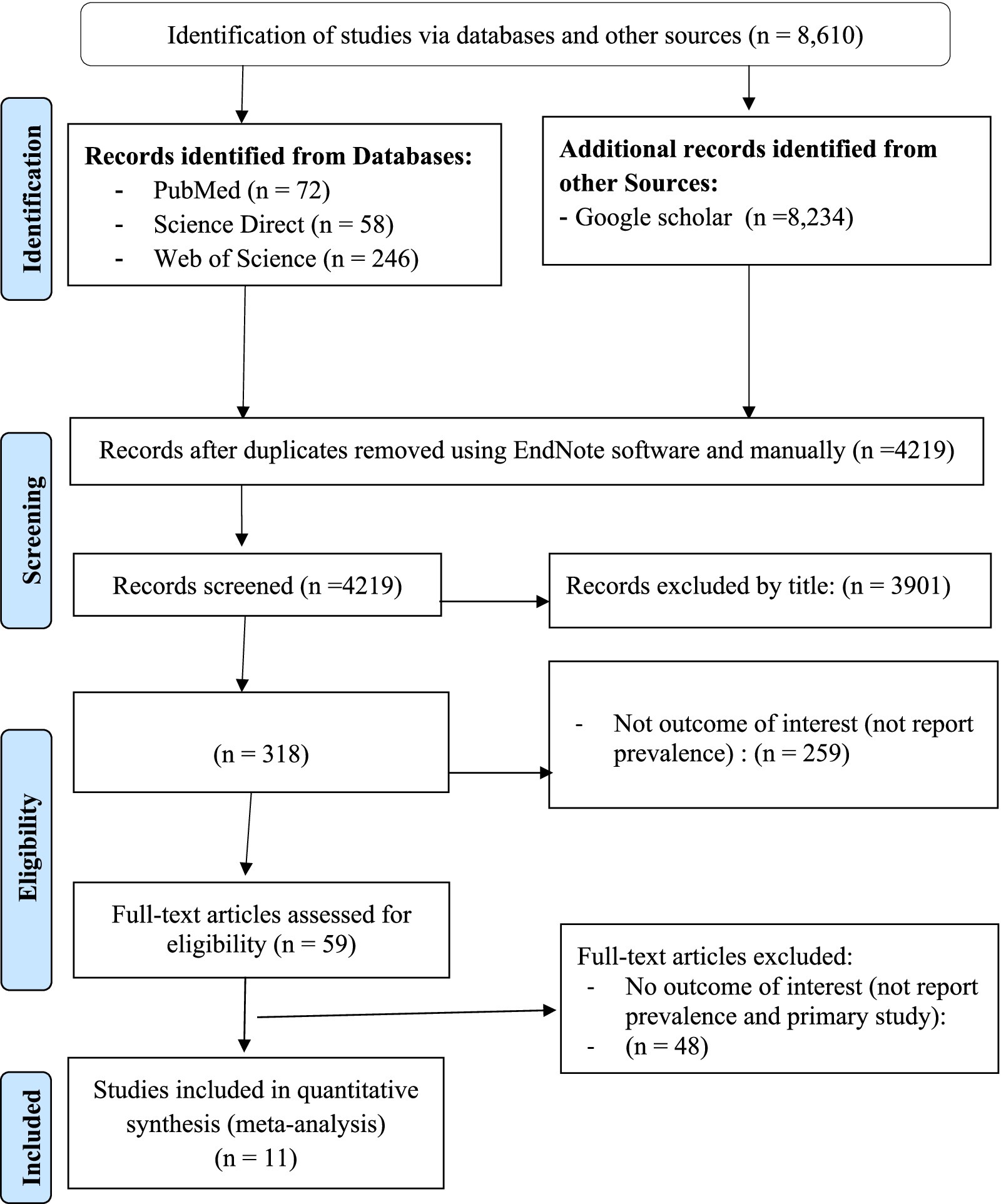 In this umbrella review, a total of 8,610 studies were retrieved from searched electronic databases and other sources, such as Google Scholar. Of the total, 4,219 articles were non-duplicated and subjected to further evaluation. The 4,171 articles were assessed and excluded after reviewing their title, abstract, and other reasons (duplicate studies, primary studies, and others), while 59 articles were retained for full-text evaluation. After a full-text review, the final umbrella review included 11 potential articles (15–23, 26, 27) that reported on the prevalence of TB in Ethiopia (Figure 1).