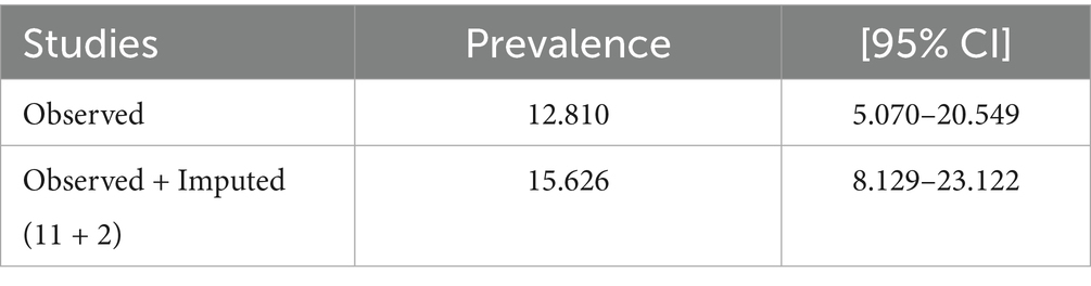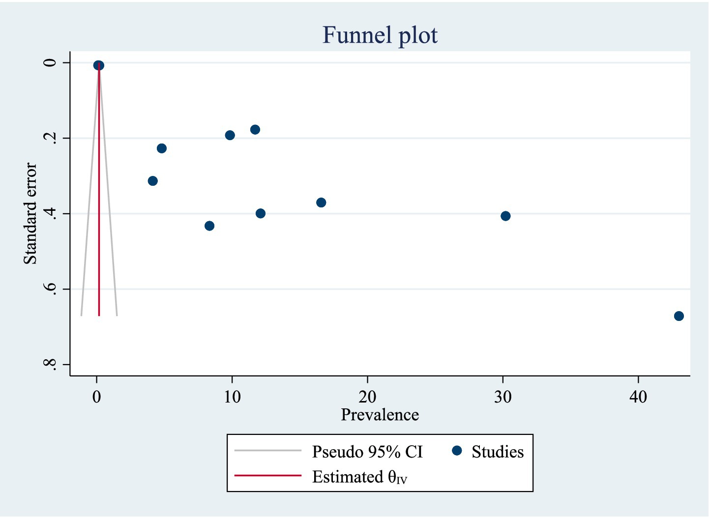 Stata version 17 (Stata Corp. Stata Statistical Software; College Station, TX: Stata Corp LP) was used to examine the retrieved data after it was imported into Microsoft Excel. A random-effects model was used to generate a summary estimate of the prevalence across studies. The point estimate was used with a 95% confidence interval. Sensitivity analysis was performed to analyze the role of each study in the final conclusion by omitting each study one at a time, and the presence of publication bias was determined by visually evaluating funnel plots and using Egger’s test. A bias-adjusted effect estimate was obtained by performing trim and fill analysis technique. Inverse of variance (I2) statistics were used to assess study heterogeneity (25). A value of ≥50% was considered significant. To identify sources of heterogeneity in studies with significant differences (I2 ≥ 5 0%), we conducted subgroup analyses.