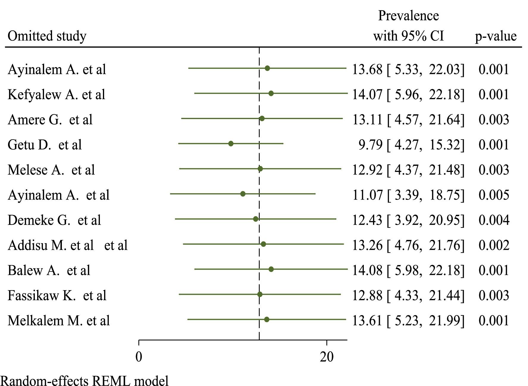In sensitivity analyses using the leave-one-out strategy, eliminating none of the studies had a significant influence on pooled burden estimates and heterogeneity measures within review studies. As a result, sensitivity analysis using the random-effects model revealed that no single study altered the overall prevalence of TB (Figure 3).