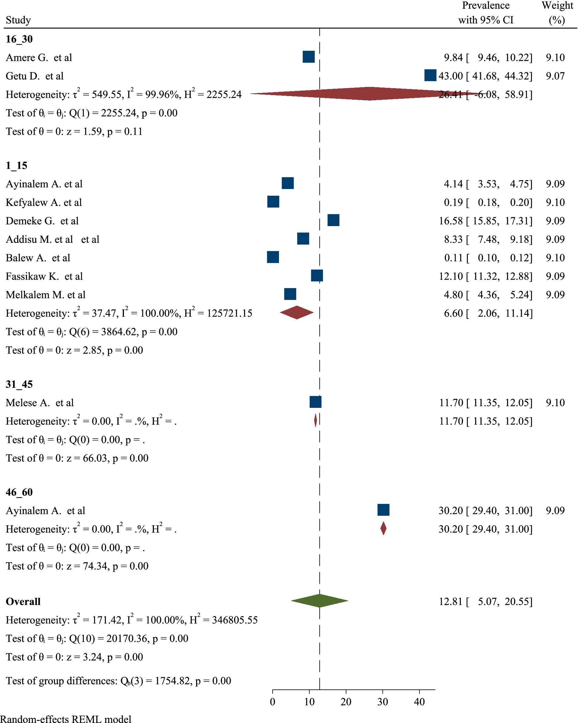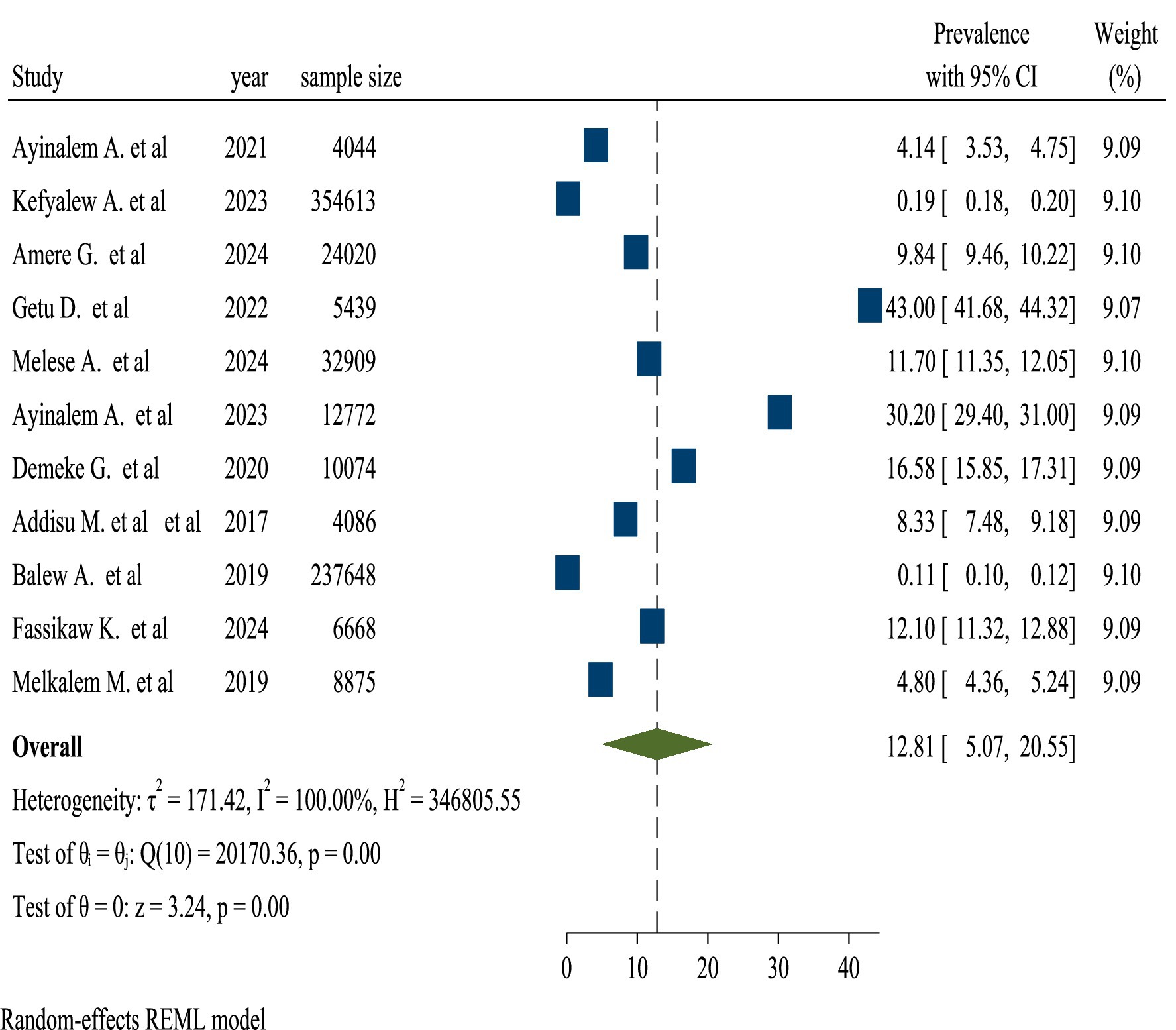 The pooled TB prevalence was 12.81% (95% confidence interval, 5.07–20.55). A random-effects model reveals heterogeneity among studies on the prevalence of TB with a 95% confidence interval (I2 = 100% and p-value = 0.00). Because of the high heterogeneity between the included studies, subgroup analysis was carried out to know the prevalence of TB among review articles (Figure 4).