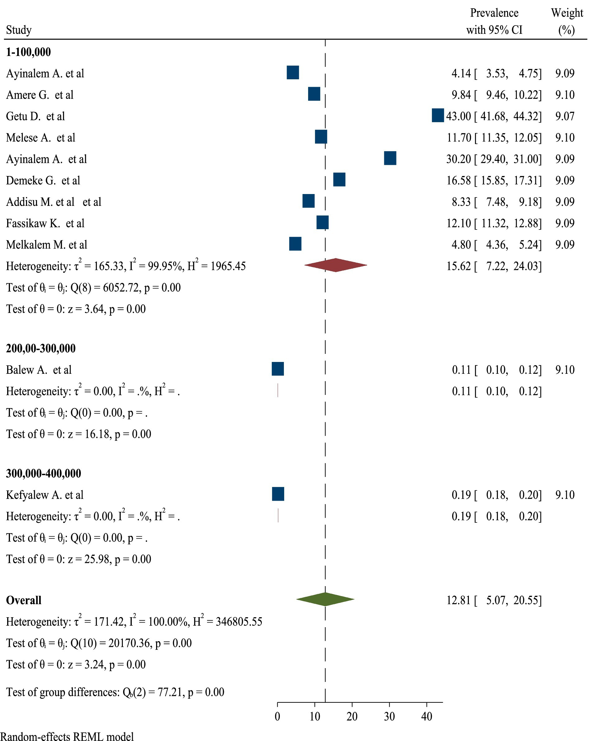 High significant heterogeneity was found among included studies regarding TB prevalence. Inverse of variance (I2) statistics revealed greater than or equal to 100% heterogeneity among studies for TB prevalence. Subgroup analysis was conducted for TB prevalence on number of sample size and number of studies in order to determine the potential source of heterogeneity. As a result, the analysis revealed a significant difference in TB frequency among studies on number of sample size and number of studies (Figures 5, 6), respectively.