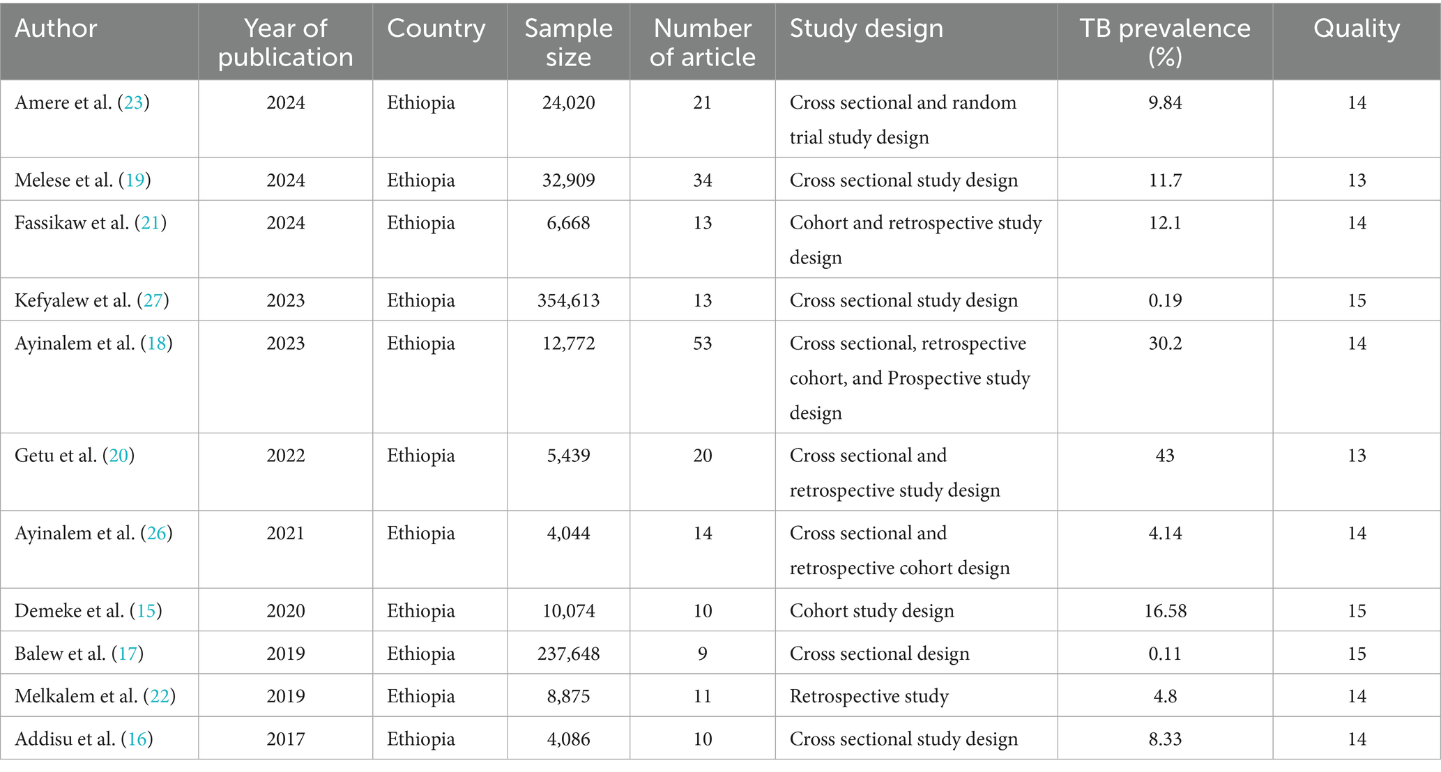 Previous studies have various limitations that impact the generalizability of their findings. These consisted mostly of cross-sectional studies, which presented snapshots of the situation rather than demonstrating the dynamic character of the study population. The aggregated results might be influenced by the various diagnostic techniques for TB used in these studies (15–23). To overcome these shortcomings, this umbrella review develops on previous reviews by investigating the studies and data sources. The future studies should overcome the gaps found in previous reviews by covering both published and unpublished research as well as studies in different languages. Furthermore, this study takes a more comprehensive approach to assess the TB burden in Ethiopia, using a more robust methodology. This strengthens the findings and offers a more complete picture of the TB situation in Ethiopia. Overall, while past shortcomings are acknowledged, this review provides a better picture of the incidence of TB in the country.