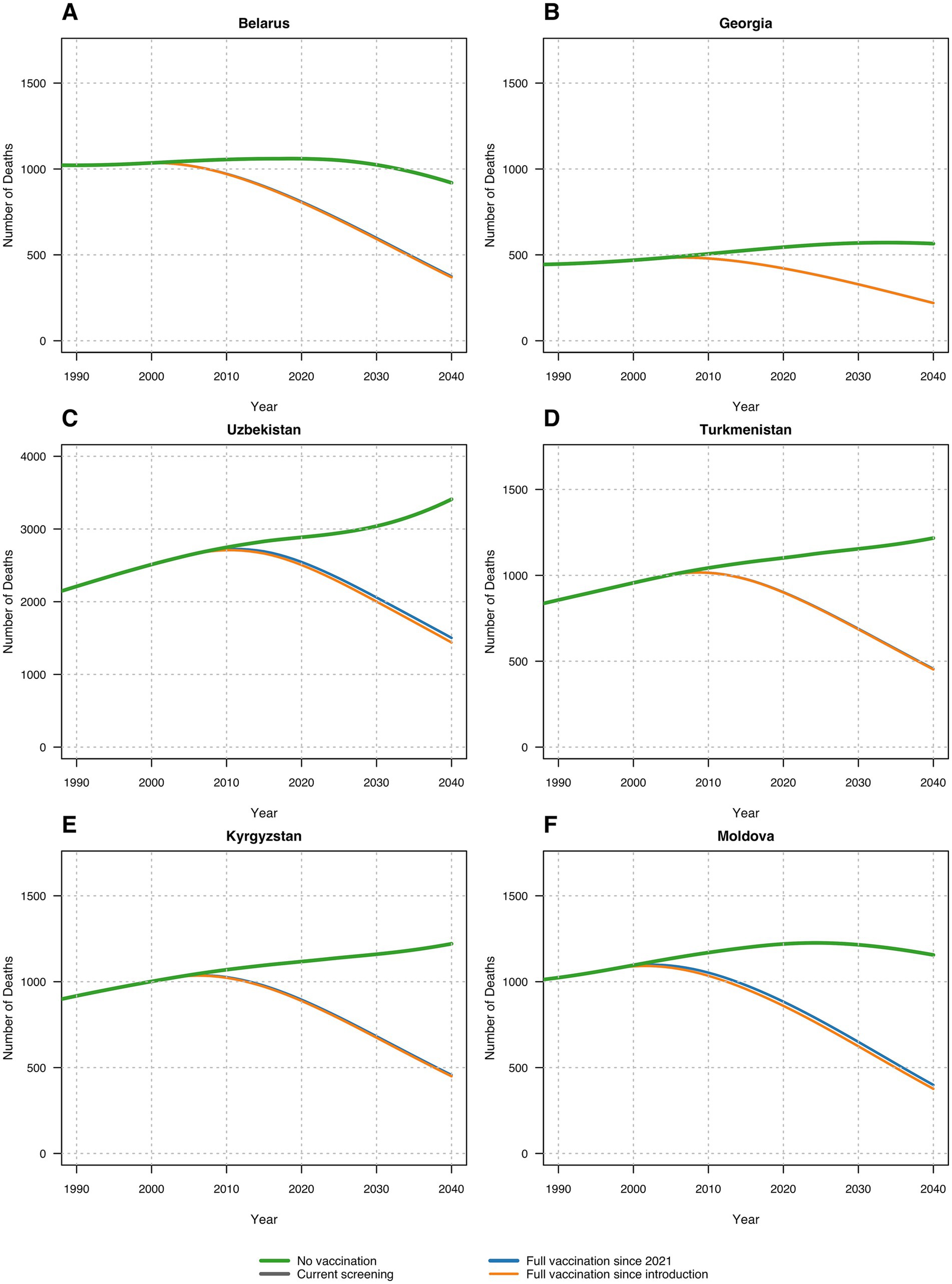 Figure 2. Number of deaths in each scenario across six countries: (A) Belarus; (B) Georgia; (C) Uzbekistan; (D) Turkmenistan; (E) Kyrgyzstan; (F) Republic of Moldova.