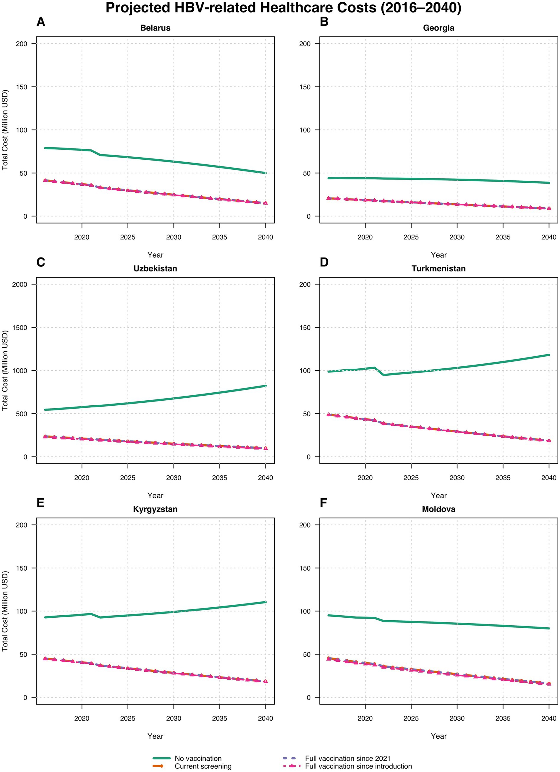 Figure 3. Estimated costs of HBV treatment (including acute phase treatment costs) across scenarios and countries: (A) Belarus; (B) Georgia; (C) Uzbekistan; (D) Turkmenistan; (E) Kyrgyzstan; (F) Moldova. Lines for optimal vaccination scenarios visually overlap because cost differences are small relative to the million USD scale.
