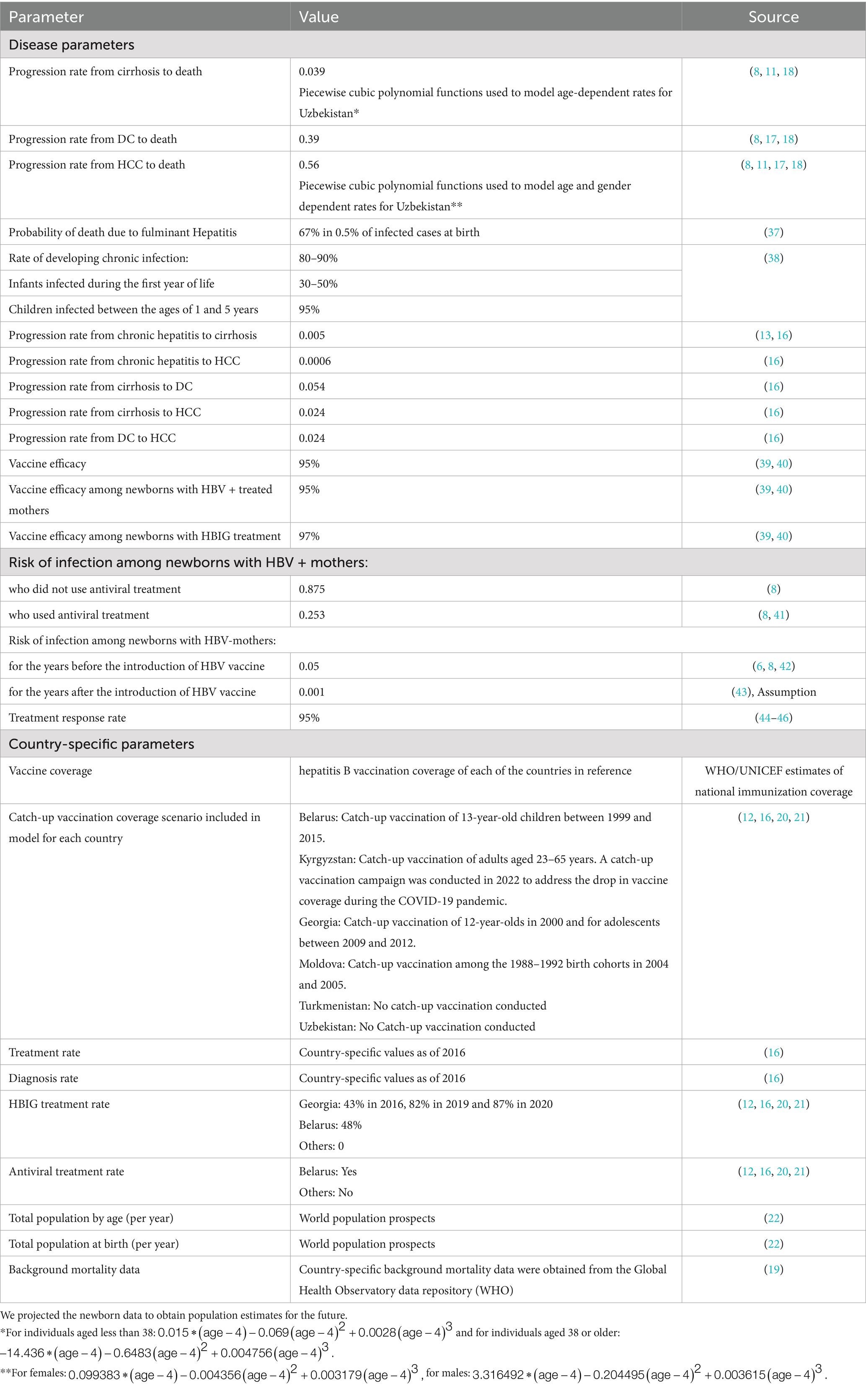 The model used the following population-specific data to calculate disease burden and the reduction in disease burden from hepatitis B vaccination: annual size of birth cohorts, total population of the country, sex ratio at birth, prevalence of HBV infection among pregnant women, prevalence of HBV in the general population, annual hepatitis B vaccination coverage, rate of hepatitis B diagnosis, treatment rate and overall background mortality rate of the population (as a competing risk factor). To parameterize and populate the model, we conducted a literature review to gather country-specific and regional/global demographic and epidemiological data (7, 8, 11, 16–18). Additionally, the required epidemiological data and the hepatitis B vaccination coverage were collated from various data sources as the WHO Global Health Observatory data repository (19), the Fourth & Fifth Meeting reports of the European Technical Advisory Group of Experts Working Group on hepatitis B (12, 20), and meeting reports from the coalition for global health elimination (21) and, population data from the United Nations, World Population Prospects 2022 (22). Table 1 outlines the input parameters used in our model.