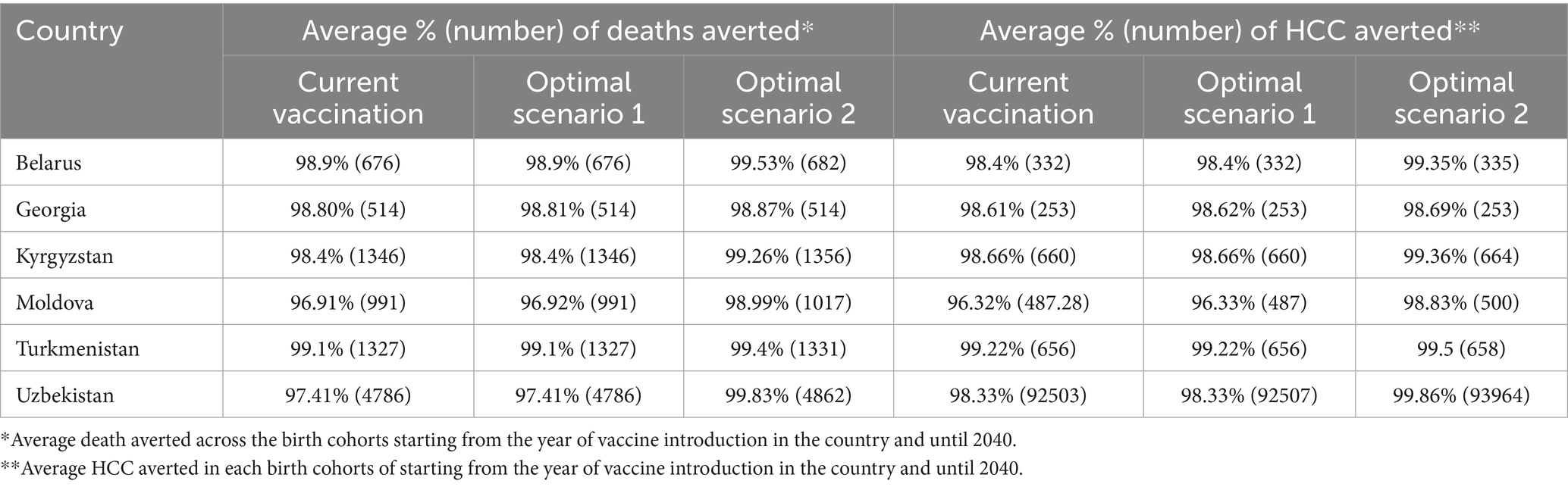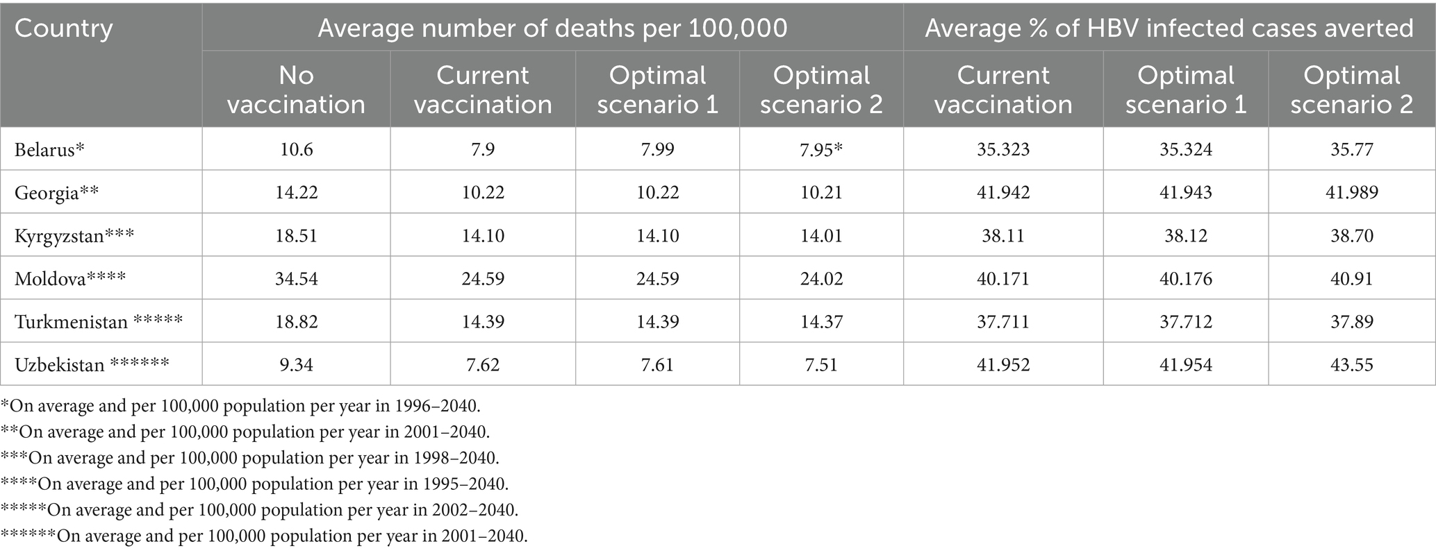 In Georgia, without vaccination, about 2.5% would contract HBV annually from 2001 to 2040, with 14.22 deaths per 100,000. Current vaccination prevents 41.94% of infections, and optimal scenarios prevent 41.94 to 41.98%. Mortality would drop to 10.22 deaths per 100,000, with 26.88 to 26.91% of deaths averted. In Georgia, without vaccination, about 2.5% would contract HBV annually from 2001 to 2040, with 14.22 deaths per 100,000. Current vaccination prevents 41.94% of infections, and optimal scenarios prevent 41.94 to 41.98%. Mortality would drop to 10.22 annual deaths per 100,000, with 26.88 to 26.91% of deaths averted. In Kyrgyzstan, without vaccination, 4.78% of the population would contract HBV annually from 1998 to 2040, resulting in 18.51 annual deaths per 100,000. Current vaccination prevents 38.12% of infections, and optimal scenarios prevent 38.12 to 38.70%. Deaths would decrease to 14.01 to 14.10 per 100,000, with 24.43 to 24.92% of deaths averted. In Moldova, without vaccination, 8.65% would contract HBV annually from 1995 to 2040, with 34.54 annual deaths per 100,000. The current vaccination program prevents 40.17% of infections, and optimal scenarios prevent up to 40.91%. Deaths would fall to 24.02 to 24.59 per 100,000, averting 25.86 to 27.40% of deaths. In Turkmenistan, without vaccination, 5.03% would contract HBV annually from 2002 to 2040, leading to 18.82 annual deaths per 100,000. The current vaccination program prevents 37.71% of infections, and optimal scenarios prevent 37.71 to 37.89%. Deaths would drop to 14.37 to 14.39 per 100,000, with 24.05 to 24.19% of deaths averted. In Uzbekistan, without vaccination, 5.71% would contract HBV annually from 2001 to 2040, with 9.34 annual deaths per 100,000. The current vaccination program prevents 41.95% of infections, and optimal scenarios prevent 41.95 to 43.55%. Deaths would reduce to 7.51 to 7.62 per 100,000, averting 18.47 to 19.66% of deaths. Table 3 summarizes these findings.