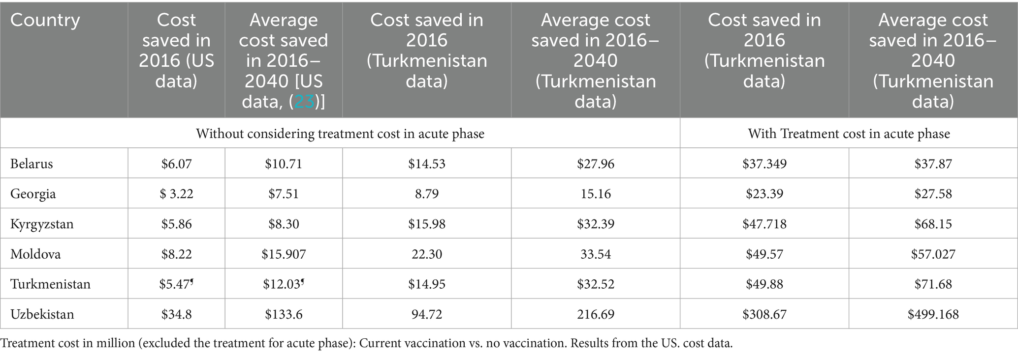 We also calculated the cost savings from the vaccination program using annual lifetime cost data from the United States (23). Additionally, we performed an analysis using treatment costs from Turkmenistan to estimate the treatment cost savings for the countries of our study, given the scarcity of detailed information for each country and the relevance of Turkmenistan’s data compared to the U.S. data. These results may change if annual data becomes available for each country.