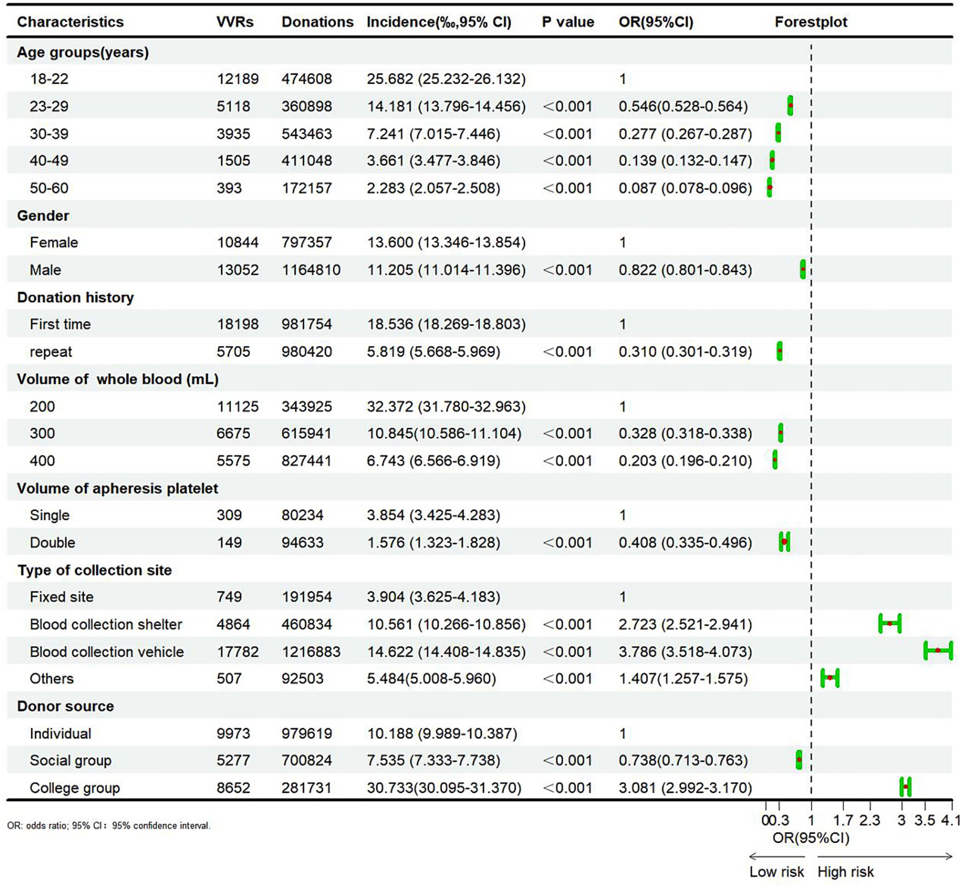 The incidence of VVRs in male blood donors (11.205%) was significantly lower than that in females (13.600%) (p < 0.01, OR = 0.822). Likewise, the incidence of VVRs was significantly lower than in repeat donors (5.819%) compared to first-time donors (18.536%) (p < 0.01, OR = 0.310).