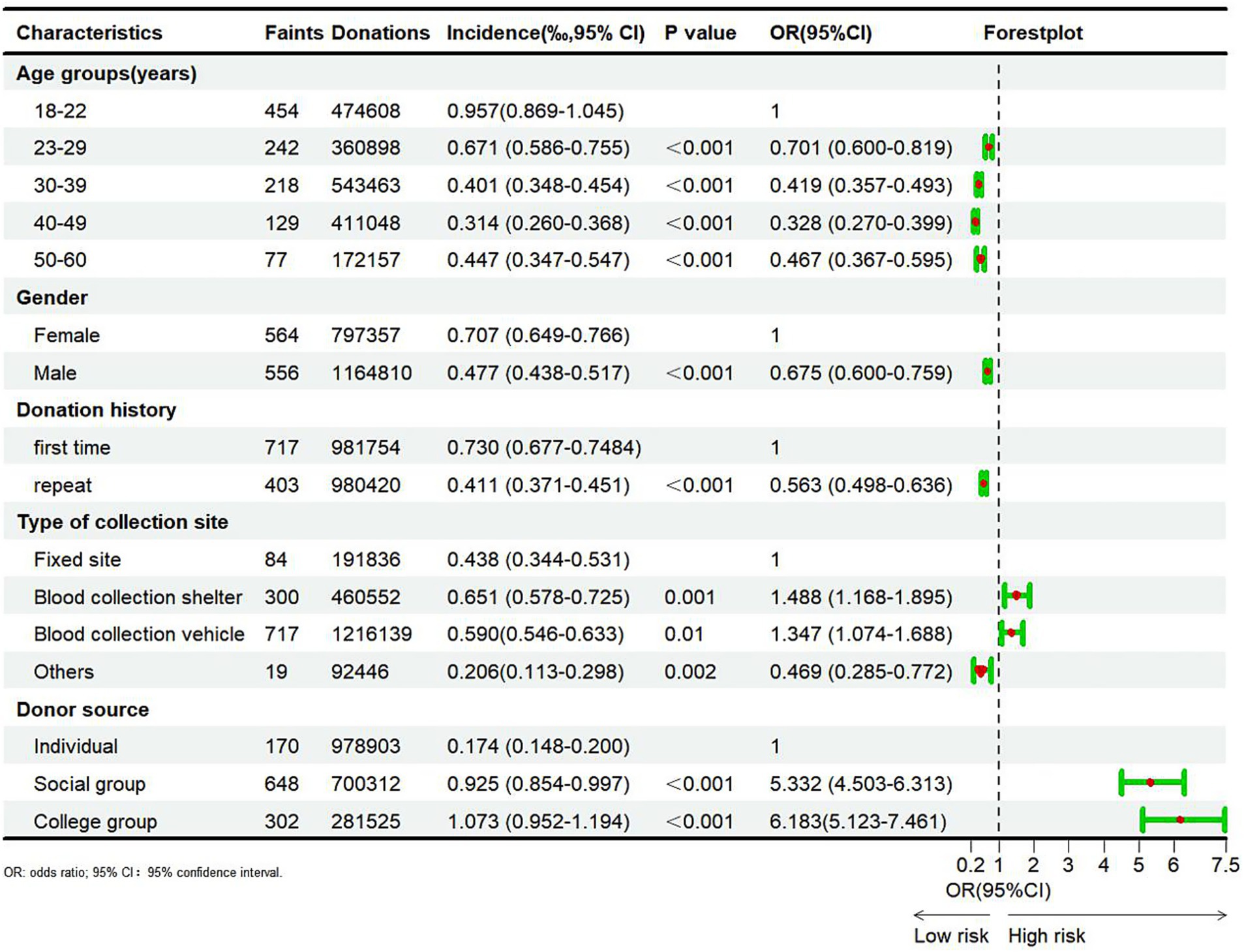 All ADR datasets were subjected to standardized data preprocessing. To mitigate the impact of missing data, data were supplemented by contacting liaison officers from Blood Services. Frequency and composition rates were used to describe the data of total donation, as well as data on the different types of ADRs. The Chi-square test was used to analyze risk factors for Vasovagal reactions (VVRs) and inter-group comparisons of VVRs stratified by age (18–22; 23–29; 30–39; 40–49; 50–60), gender (female/male), donation history (first time/repeat), and blood donation volume (200 mL/300 mL/400 mL), type of collection site (fixed site/blood collection shelter/blood collection vehicle/others) and donor source (individual/social group/high school). The same stratified analysis was further conducted on blood donors who experienced syncope to determine the risk factors. R software (version 4.2.3, R Foundation for Statistical Computing, New Zealand) was employed for statistical analyses (13). The Odds ratio (OR) and its 95% confidence interval (95% CI) were calculated to compare the reported incidence of VVR with different characteristics, p < 0.05 was considered to be statistically significant, and all p values were tested using a bilateral test.