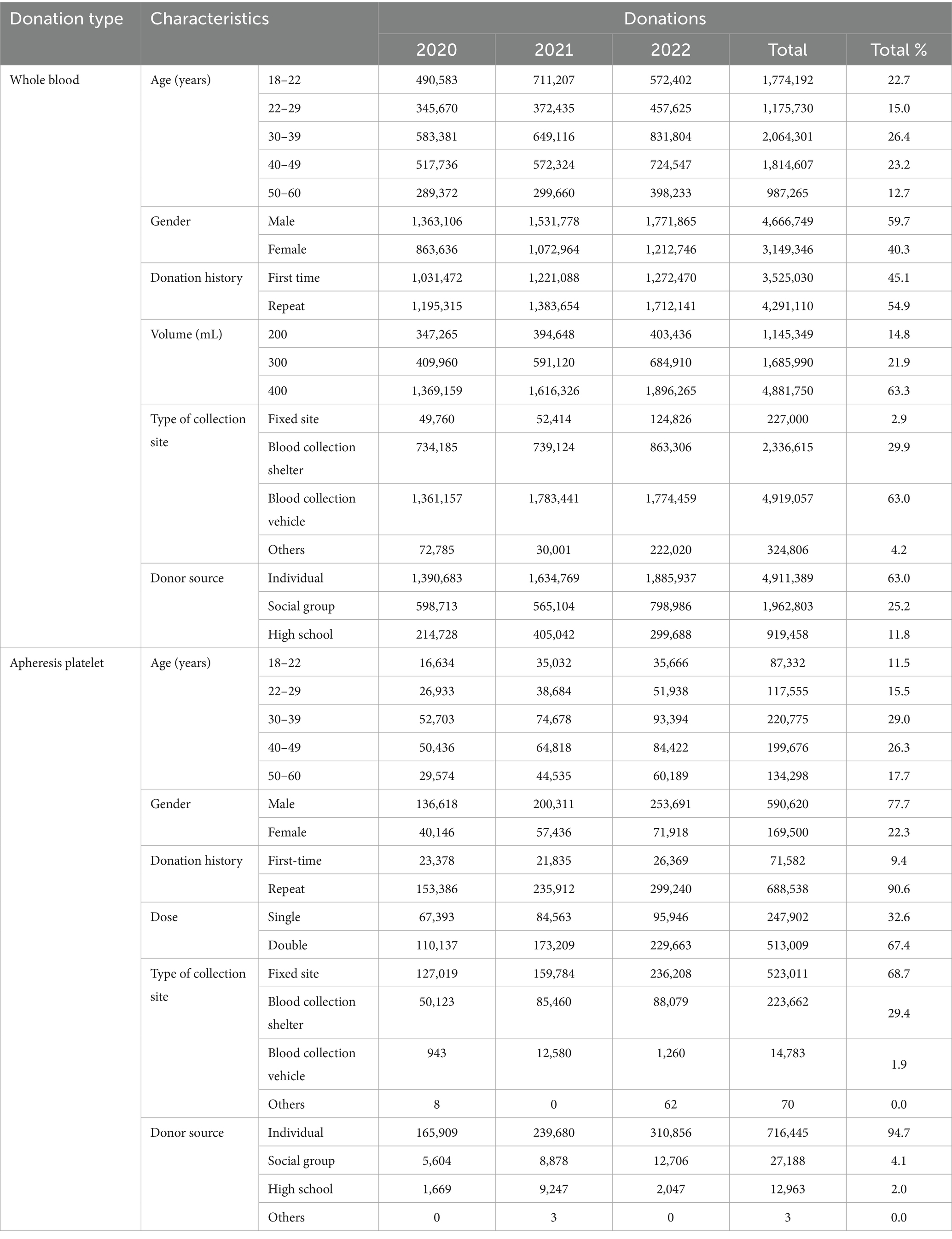 A total of 8,575,731 blood donations, comprising 7,816,095 whole blood donations and 759,636 apheresis platelet donations, were registered at Blood Services during the study period. The general donor characteristics for the study population are listed in Table 1. The analysis of the characteristics of whole blood donors showed that, donors aged 30–39 (26.4%), 40–49 (23.2%), and 18–22 (22.7%) account for 72.3% of the total whole blood donors. Male donors (59.7%) outnumber female donors (40.3%). Repeat donors (54.9%) were more than first-time donors. The majority of donors contributed 400 mL of blood (63.3%). Blood collection from mobile blood donation vehicles was the most common (63.0%). Individual donors (63.0%) far exceed those from social and university groups.