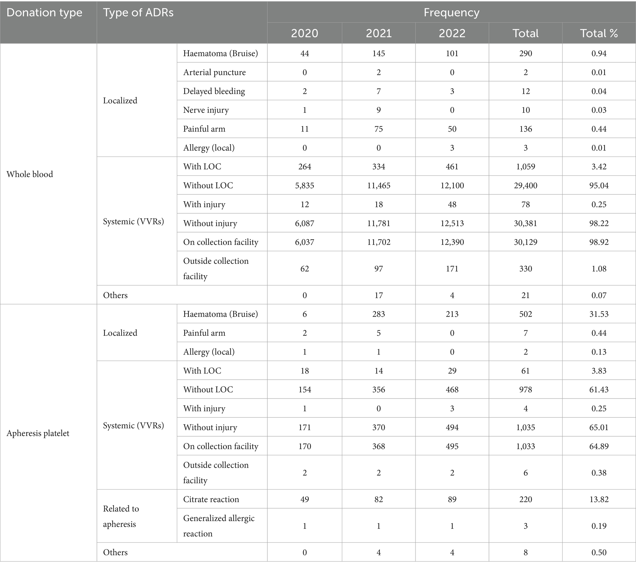 A total of 32,523 donations with ADRs were reported in Blood Services, among which 191 cases experienced two types of ADRs during the same donation from 2020 to 2022. Of these ADRs, 30,933 ADRs were related to whole blood donors, and the remaining 1,781 ADRs were associated with apheresis platelet donors. VVRs (31,498; 96.32%) were the most prevalent type of ADRs in blood donors, followed by hematoma (792; 2.56%). Next, the three VVR subclusters were subdivided according to the pre-defined grouping criteria. Among the 31,498 donors who experienced VVRs, loss of consciousness (LOC) was reported in 1,120 (3.36%). When ADRs could not be classified into the existing categories, they will be classified under the “Other” category. For example, a blood donor has a fever after donating blood (Table 2).