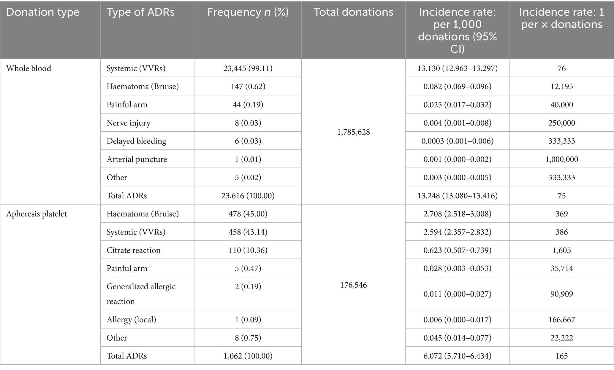 VVRs accounted for 98.47% and 58.34% of all ADRs in whole blood and apheresis platelet donors from 2020 to 2022 in China, respectively. It is worthwhile emphasizing that the rate of VVRs in whole blood donors was higher than that reported in Italy from 2016 to 2019 (93.3%) (14), IHN (83%) (15), and the 2023 European Commission SARE report (82%) (16). The rate of VVRs among apheresis platelet donors was lower than that recorded in Italy (70.3%) from 2016 to 2019 and comparable with that of IHN (57%) and the 2023 European Commission SARE report (77%). Among whole blood donors, local ADRs such as hematoma following blood donation accounted for only 0.94% of all ADRs, which was markedly lower than the 18.69% reported by IHN (8), given that whole blood donors often discover hematomas after leaving the blood collection site and may not inform Blood Services of the adverse reaction. However, the longer process of apheresis platelet collection increases the likelihood of on-site diagnosis, and the proportion of hematomas recorded in apheresis platelet donors was higher at 31.53%.