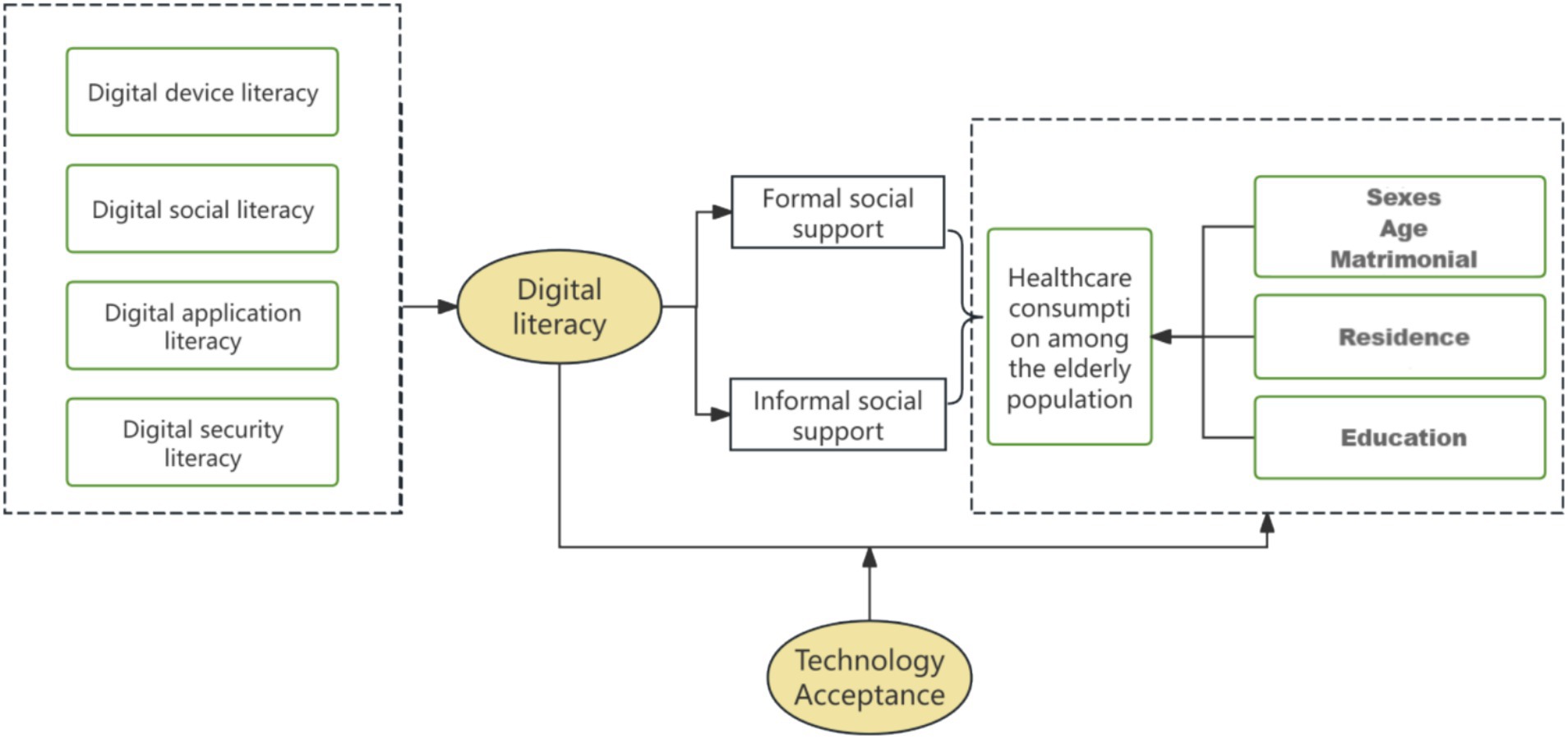 Building upon the Technology Acceptance Model and Social Support Theory, this study investigates how older adults access healthcare resources through technology acceptance and formal or informal support systems. While these two frameworks are closely related to the research topic, existing studies such as Grošelj et al. (2) investigation into non-internet usage among seniors have rarely integrated them to systematically explore the complex relationship between digital literacy and multidimensional healthcare utilisation. This research gap has hindered academic exploration of how digital literacy fundamentally influences older adults’ access to diverse medical services, such as telehealth consultations, chronic disease management programs, and preventive healthcare initiatives.
