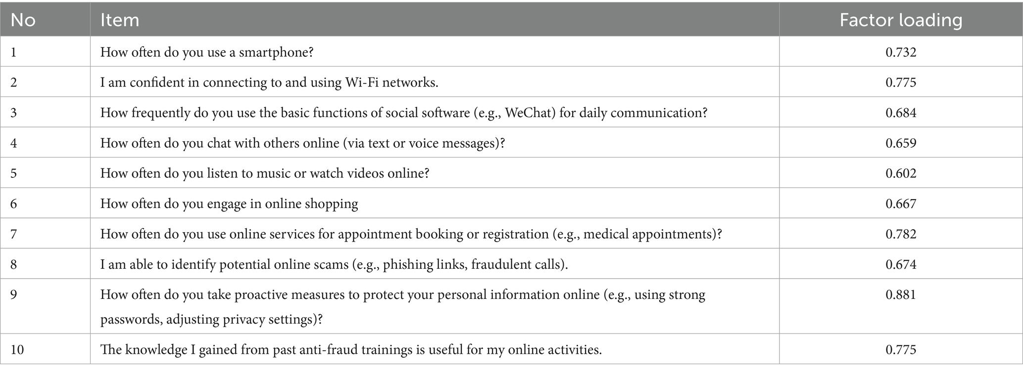 The digital literacy of older adults was assessed using a 10-item scale developed by the research team. All items were measured on a five-point Likert scale assessing the frequency of behaviors or perceived ability, where 1 = Never/Very Poor, 2 = Rarely/Poor, 3 = Occasionally/Fair, 4 = Often/Good, and 5 = Always/Very Good. A higher total score indicates a higher level of digital literacy. This 10-item scale was pretested in 50 older adults from Shanxi in 2019. Pretest results showed a Cronbach’s α of 0.91 (excellent internal consistency) and exploratory factor analysis (EFA) supported a one-factor structure (explaining 65.2% of total variance), which was consistent with the formal survey results (Cronbach’s α = 0.936, explained variance = 67.3%). The reliability and validity of the scale were confirmed. Exploratory Factor Analysis (EFA) yielded a one-factor structure that explained 67.3% of the total variance, with all factor loadings exceeding 0.6. The Kaiser-Meyer-Olkin (KMO) measure of sampling adequacy was 0.92, and Bartlett’s test of sphericity was significant (χ2 = 1584.7, df = 45, p < 0.001), indicating the data were highly suitable for factor analysis. The Cronbach’s alpha for the overall 10-item scale was 0.936, demonstrating excellent internal consistency (31), which ensures the reliability and internal consistency of the data (Table 1).
