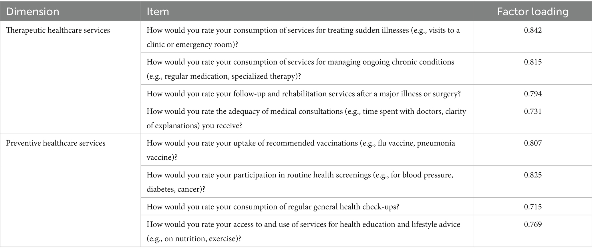 The focal point of this study is the consumption of healthcare services by older adults. Healthcare service consumption mainly includes therapeutic healthcare services and preventive healthcare services. Preventive healthcare services refer to the prevention of diseases by means of vaccination before the occurrence of diseases, while treatment of diseases refers to the treatment of diseases after the occurrence of diseases. This 8-item scale was pretested in 40 older adults from Shanxi in 2018, with pretest Cronbach’s α = 0.89 (total scale) and EFA supporting a two-factor structure (explaining 68.1% of total variance). The reliability and validity of the Consumption of healthcare services Scale are tested Using SPSS 22.0 software.