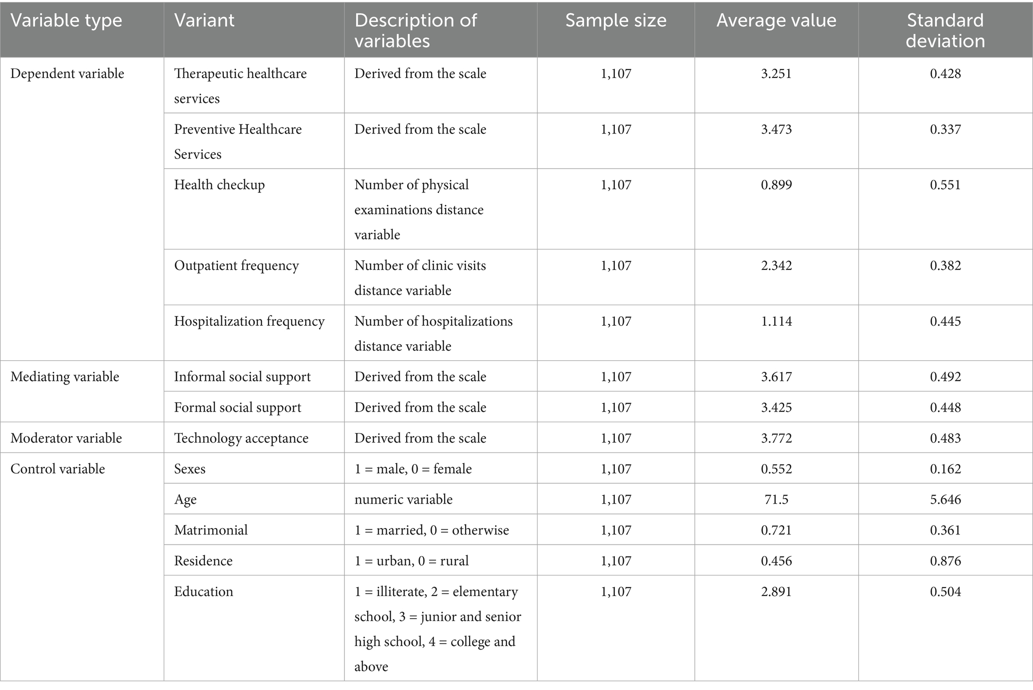 Among the 1,107 respondents in this survey, the gender distribution was slightly more male, with 611 males (accounting for 55.2%) and 496 females (accounting for 44.8%). In terms of place of residence, the rural sample was slightly larger than the urban one: there were 602 people (54.4%) in rural areas and 505 people (45.6%) in urban areas. The average age of the older adults are 71.5 years old. In terms of marital status, 72.1% (approximately 798 individuals) are married, while the remaining 309 (27.9%) are unmarried, divorced, widowed or in other circumstances. The average score of educational attainment is 2.89, approaching the “junior high school and senior high school” level. The specific book data is detailedly reported in Table 2.