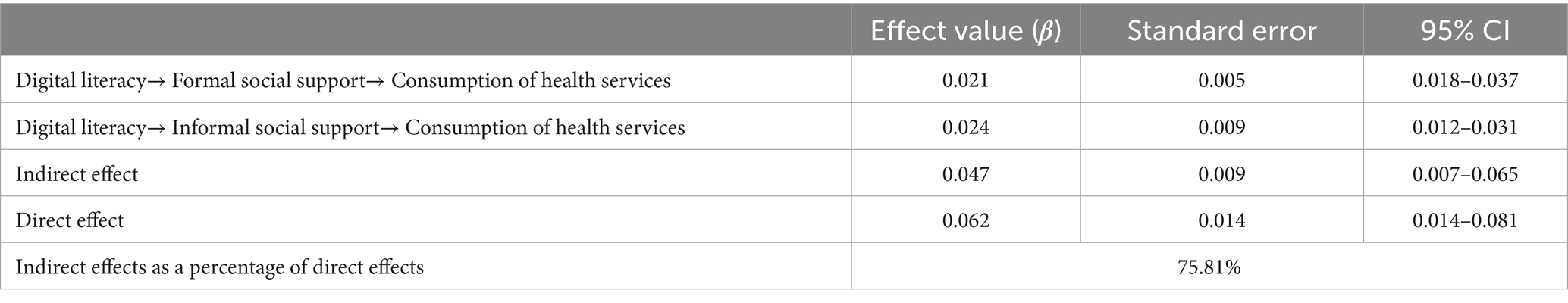 As demonstrated in Table 6, further mediation effect analysis revealed that both formal and informal social support play a significant mediating role in the relationship between digital literacy and healthcare service consumption among older adults. The analysis of the effect of digital literacy on healthcare service consumption through the two mediating paths of formal social support and informal social support shows that the indirect effect of digital literacy on healthcare service consumption through both formal social support and informal social support presents a significant effect, with a larger effect value of informal social support of 0.024, followed by a formal social support effect value of 0.021. It is noteworthy that the 95% confidence intervals for these indirect effects do not include zero, thereby underscoring the significance of these paths. Furthermore, the effect value for the total indirect effect was 0.047 with a standard error of 0.009 and a confidence interval of 0.007–0.065, indicating a significant indirect effect. The effect value for the direct effect was 0.062 with a standard error of 0.014, indicating a significant direct effect. The indirect effect accounts for 75.81% of the direct effect, indicating that the impact of digital literacy on healthcare service consumption mainly produces effects through social support. For formal social support, the improvement of digital literacy facilitates is positively associated with the access to resources such as online health consultation and distance education provided by governmental or organisational institutions, and to obtain professional and structured support, which in turn promotes healthcare service consumption. With regard to informal social support, the utilisation of digital technologies such as social media and video calling facilitates ongoing communication between older adults and their friends and relatives, irrespective of geographical location, and enables access to personalised healthcare service information. This immediate and well-attuned support positively impacts healthcare service consumption. Several recent studies have reported the same pattern: Studies have pointed out,increased e-health literacy predicted more frequent use of patient portals and tele-visits, but not more emergency visits (32). Similarly, Bhatia et al. (33) point out that higher Digital Literacy led to a 34% increase in virtual care utilisation and a parallel 22% reduction in outpatient clinic visits.