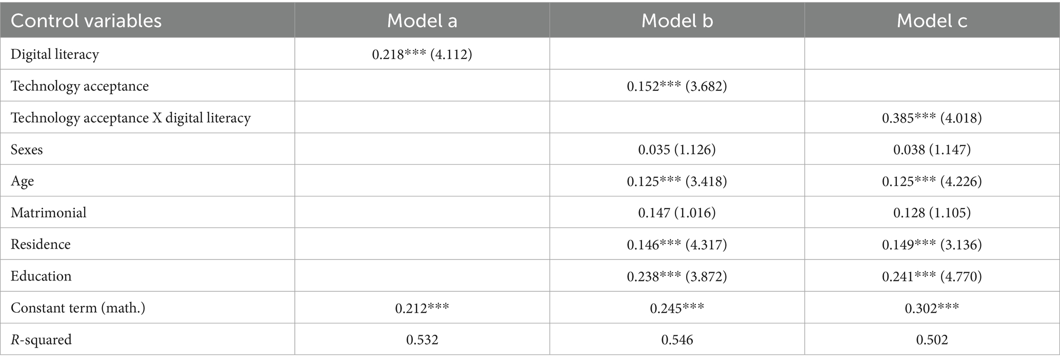 Technology acceptance has been demonstrated to play a moderating role in the relationship between digital literacy and healthcare consumption. Research conducted thus far has indicated a positive correlation between technology acceptance and the utilisation of health information technology among the older adults. This suggests that older adults who hold a favorable attitude towards technology may find greater utility in digital technology for accessing healthcare services. This finding is in alignment with the theoretical framework of technology acceptance proposed by Davis, who incorporated the Theory of Reasoned Behavior to examine the acceptance of information systems by users. Consequently, this demographic is more likely to employ electronic health records and telehealth services, among other applications (41). This is also consistent with the content of the technology acceptance model proposed by Davis when he used (23) rational behavior theory to study users’ acceptance of information systems, whereby this group of older adults is more likely to use electronic health records. Therefore, the technology acceptance of older adults influences their willingness to consume digital tools to access healthcare services, thus moderating the impact of digital literacy on healthcare service consumption, and higher technology acceptance can further enhance the positive effect of digital literacy on healthcare service consumption (42).