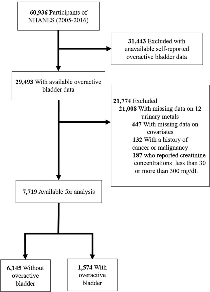 Flowchart showing participant selection from NHANES 2005-2016. Starting with 60,936 participants, 31,443 were excluded for unavailable self-reported overactive bladder data, leaving 29,493. From these, 21,774 were excluded due to missing data on urinary metals, covariates, cancer history, or abnormal creatinine concentrations. This left 7,719 participants for analysis, of whom 6,145 did not have overactive bladder and 1,574 did.