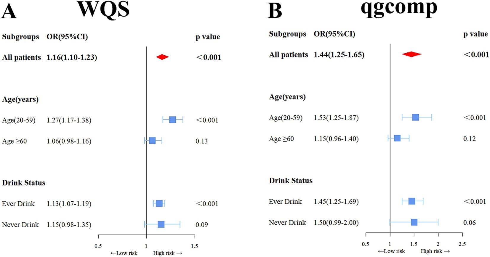 Two forest plots compare odds ratios (OR) and confidence intervals (CI) for different subgroups. Plot A uses the WQS method, showing ORs for all patients at 1.16, with significant p-values. Subgroups include age and drink status. Plot B uses the qgcomp method, showing higher ORs at 1.44, with significant p-values. Both plots compare risk levels, indicating variations by age and drinking habits.