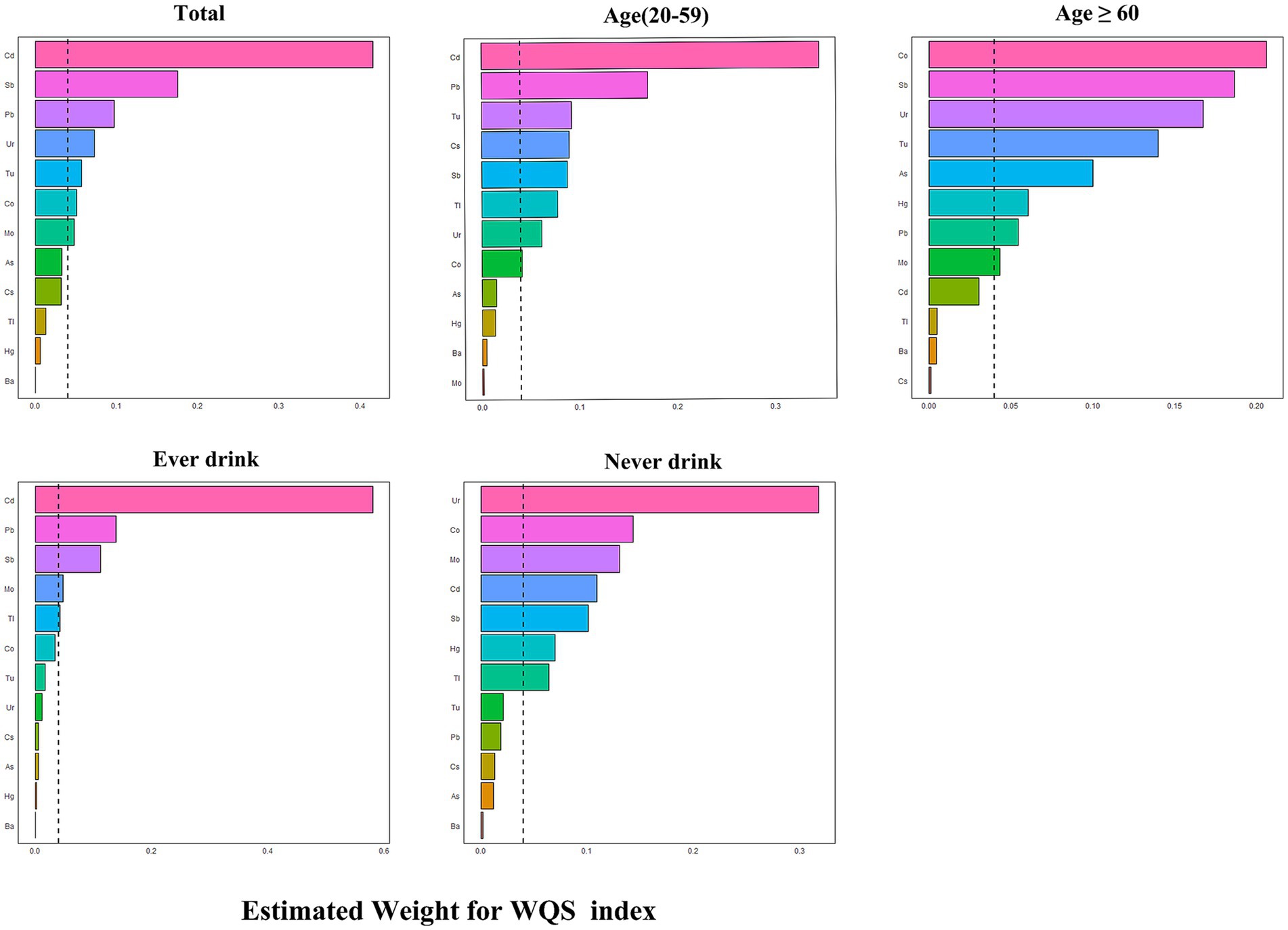 Figure 2A in the study shows a notable rise in the risk of OAB linked to the WQS index of urinary metals (OR: 1.16, 95% CI: 1.10–1.23), showing that being exposed to urinary metals together has a stimulating effect on OAB. Urinary metals and OAB were shown in the subgroup analysis, which was stratified by age and alcohol consumption, which were strongly positively correlated in the young and middle-aged group and ever-drinkers group (OR: 1.53, 95% CI: 1.25–1.87) and (OR: 1.45, 95% CI: 1.25–1.69), respectively. Nevertheless, this correlation did not reach statistical significance in the older adult and never-drinkers groups (OR: 1.15, 95% CI: 0.96–1.40) and (OR: 1.45, 95% CI: 0.99–2.00). The weight estimation for each WQS index is illustrated in Figure 3. In urinary mixtures, Cd displayed the highest weight across the entire population, as well as in the young and middle-aged groups and the ever-drinkers group. In contrast, Co and Ur were identified as the predominant weighted metals in the older adult group and the never-drinkers group, respectively.