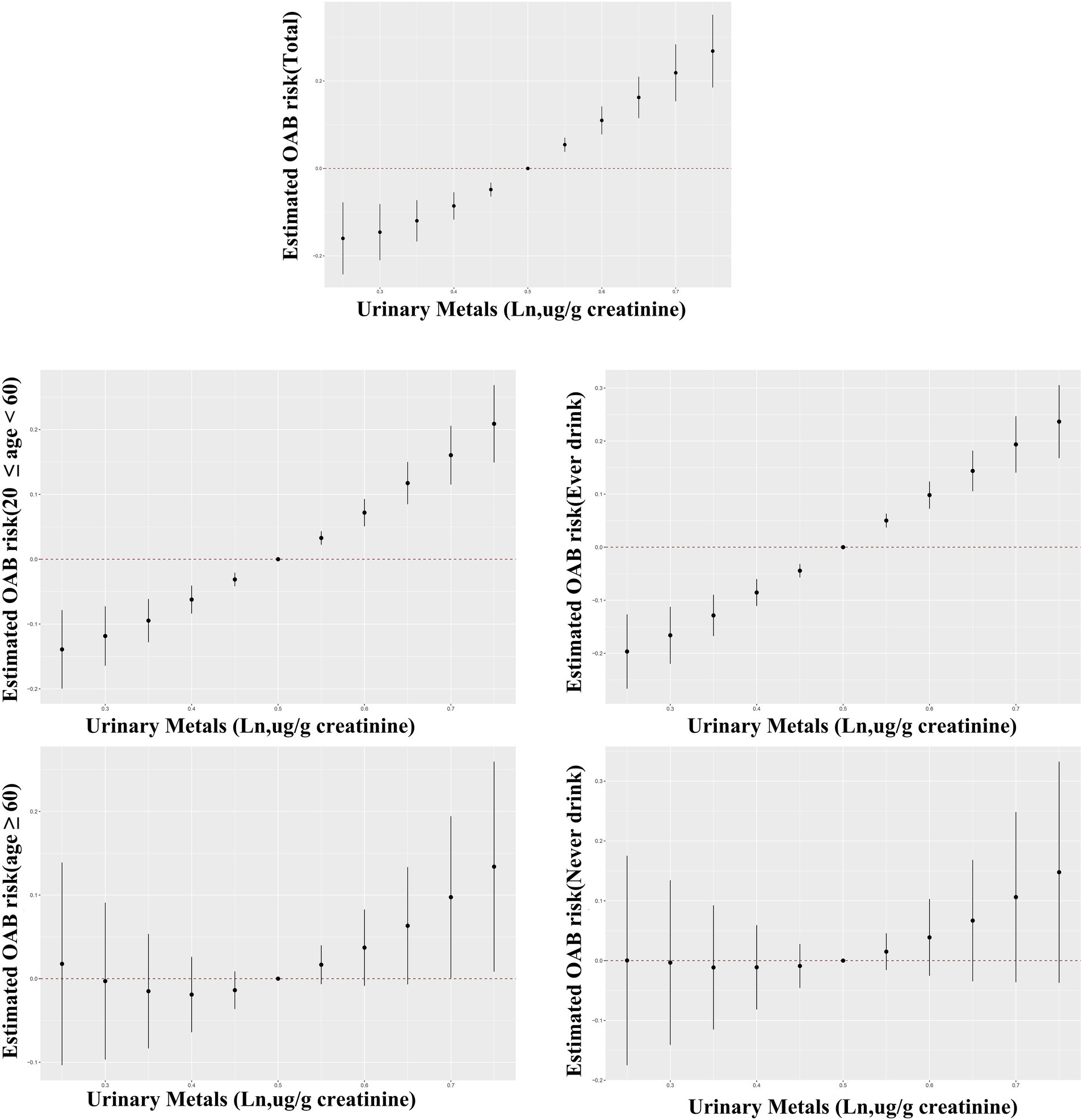 Five scatter plots show the estimated risk of overactive bladder (OAB) related to urinary metal levels measured in logarithmic scale (Ln, micrograms per gram creatinine). The plots represent different groups: total, ages under 60, ages 60 and over, those who have ever drunk alcohol, and those who have never drunk alcohol. Each plot indicates increasing risk with higher metal levels, especially pronounced in the total, younger age group, and ever drinkers. Error bars reflect variability or uncertainty in the estimates.
