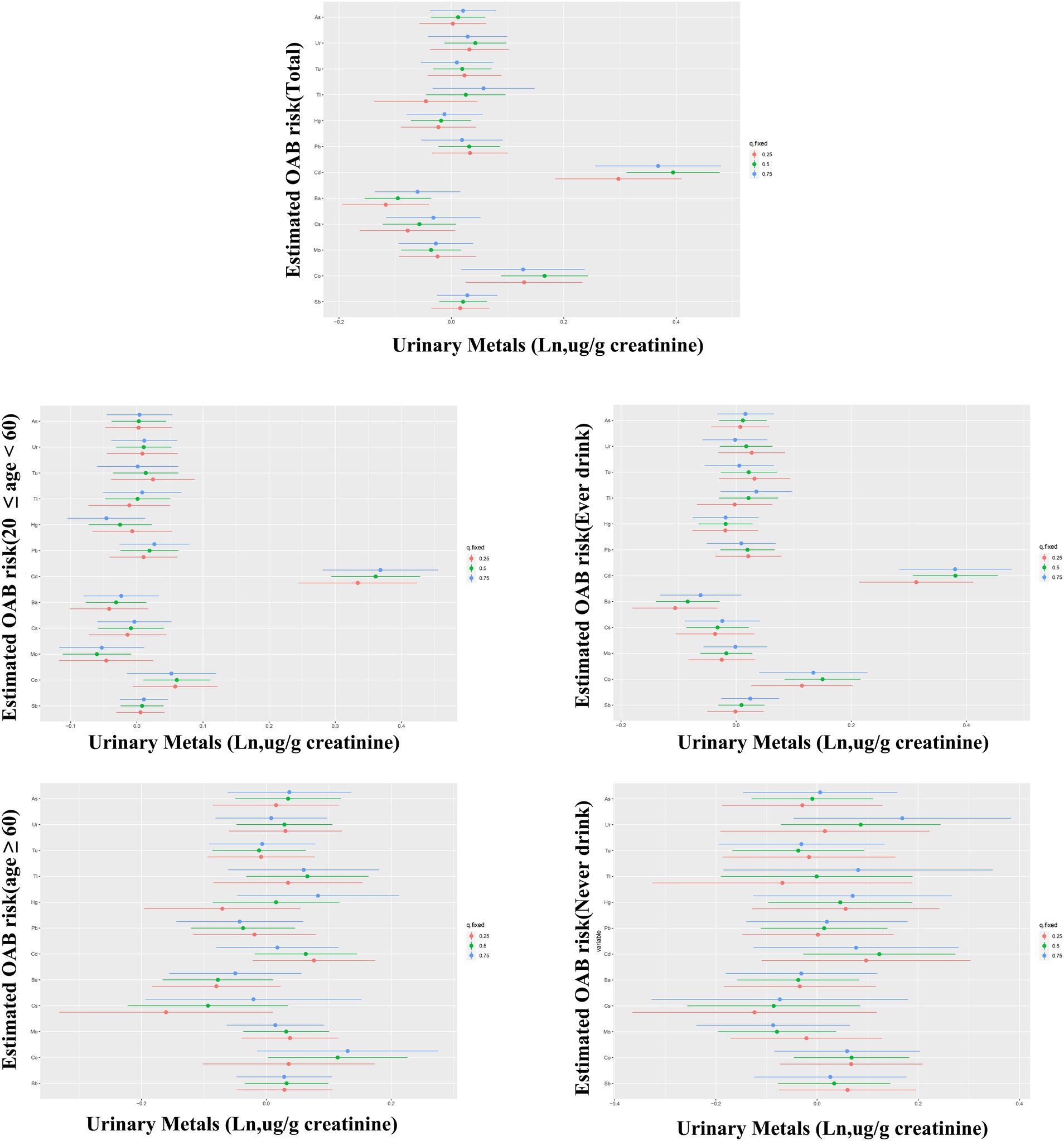 Figure 5. Bayesian kernel machine regression (BKMR) models showcase the associations of single urinary metals with OAB risk in the total population and subgroups. Metals are evaluated when all other metals are held at corresponding 25th (red), 50th (green), or 75th (blue). The models were adjusted for age, sex, race/ethnicity, education, poverty-income ratio, marital status, body mass index, smoking habit, alcohol consumption, diabetes, stroke, hypertension, urine creatinine, and NHANES cycles.