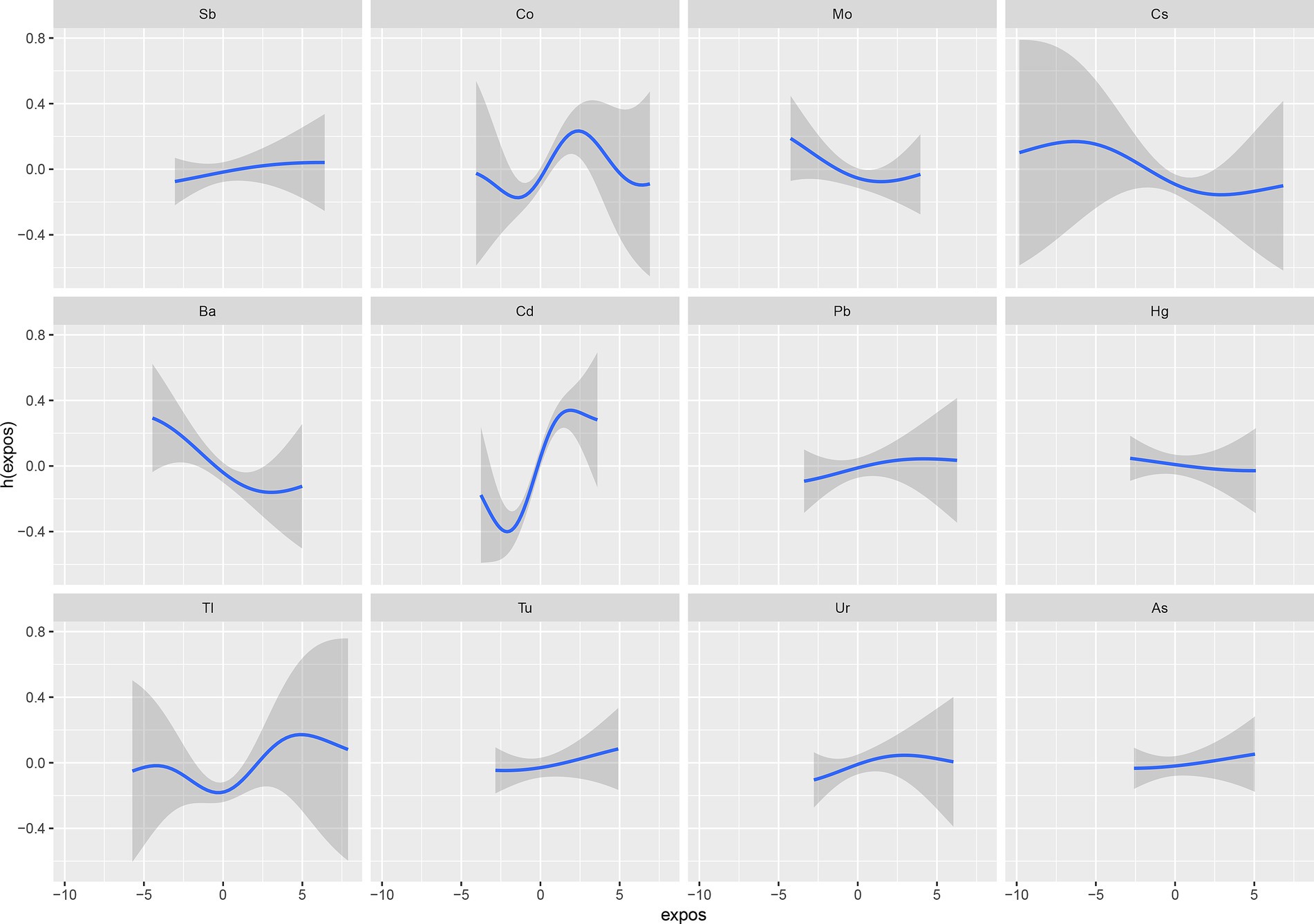 Twelve line graphs show the relationship between exposure levels (expos) and logarithmic transformation of a response variable (ln(expos)) for different elements: Sb, Co, Mo, Cs, Ba, Cd, Pb, Hg, Tl, Tu, Ur, and As. Each plot contains a blue line with a shaded gray confidence interval, showcasing varying patterns, including linear and nonlinear trends.