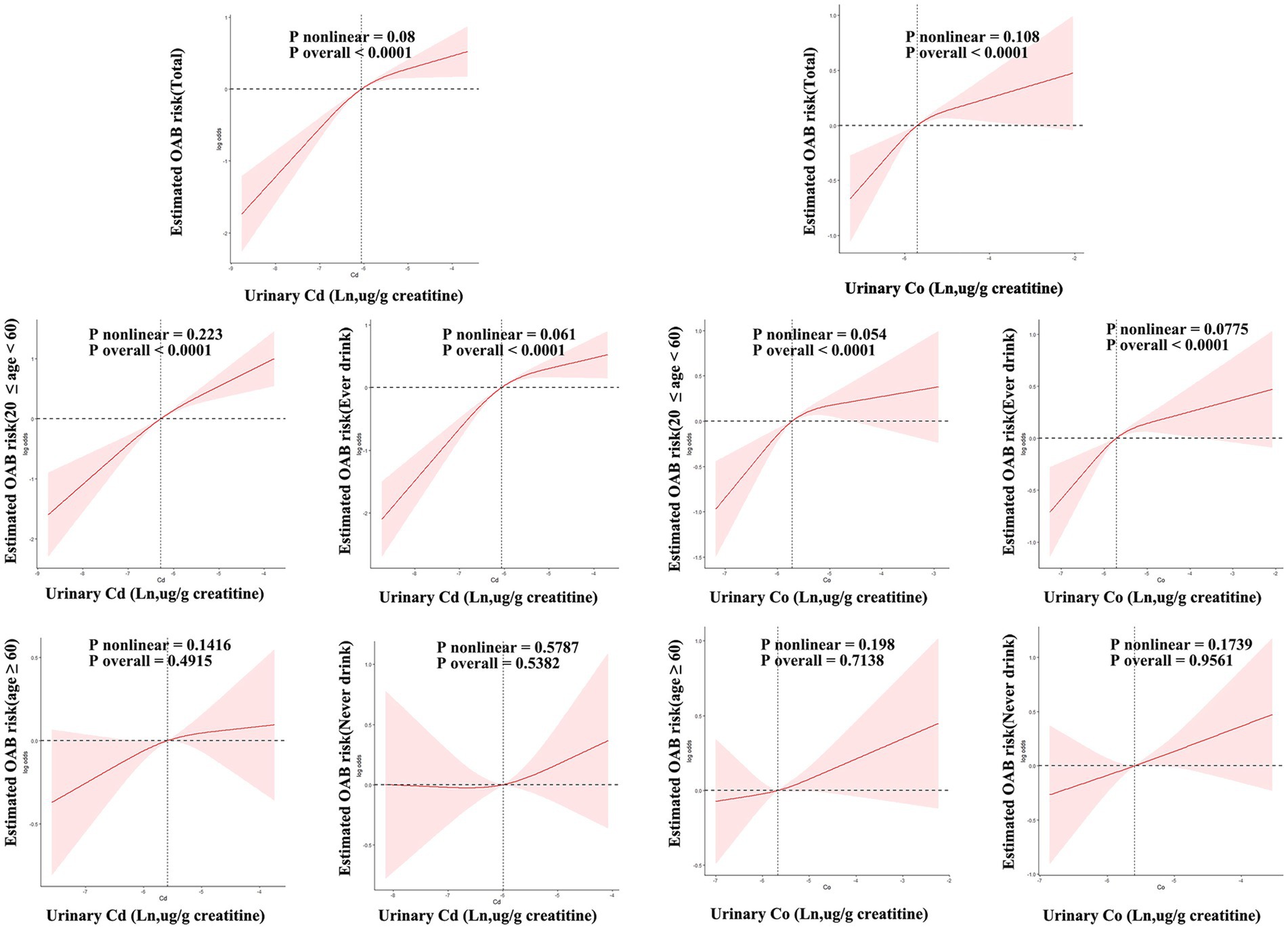 Figure 7. Restricted cubic spline (RCS) models unveil the dose–response relationship between urinary cadmium (Cd), Co, and OAB risk. The models were adjusted for age, sex, race/ethnicity, education, poverty-income ratio, marital status, body mass index, smoking habit, alcohol consumption, diabetes, stroke, hypertension, urine creatinine, and NHANES cycles. The solid line signifies odds ratios, while the red-shaded area signifies the 95% CI.