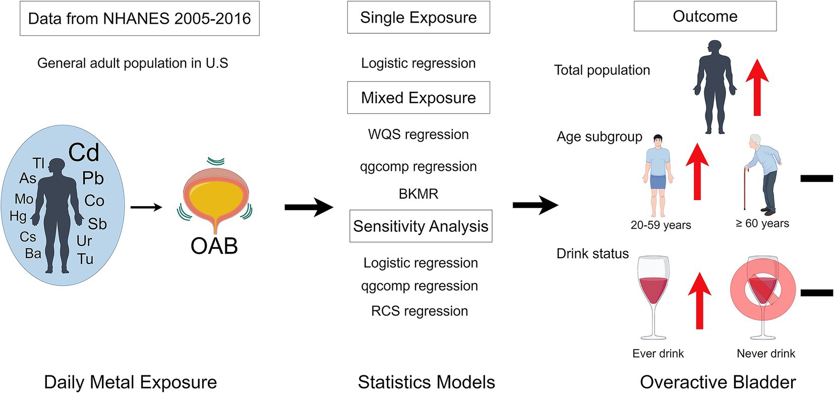 This study, using a cross-sectional design, is the first to deeply analyze the combined influence of urinary metal mixtures on OAB risk within a broad, nationally representative sample. Employing multiple statistical methods, our findings reveal that individuals diagnosed with OAB exhibited significantly increased urinary Cd, Co, and Pb concentrations compared with those without OAB. Single logistic regression models for individual metals found that urinary levels of Cd, Pb, Co, and Sb are independent risk factors for OAB. Logistic regression models demonstrated a meaningful positive connection for multiple metals. Between urinary Cd and Co with OAB risk, while Ba demonstrated a protective effect against OAB. A consistent significant positive association between co-exposure to urinary metals and OAB risk was shown by both WQS regression and BKMR models, which also identifying Ba as the primary contributing factor. Further evidence for these findings was provided by the qgcomp model and RCS regression analysis. A systematic review by (37) identified several pathophysiological phenotypes of overactive bladder (OAB), such as detrusor and urothelial dysfunctions, autonomic nervous system dysfunction, metabolic syndrome, sex hormone deficiency, and changes in urinary microbiota.
