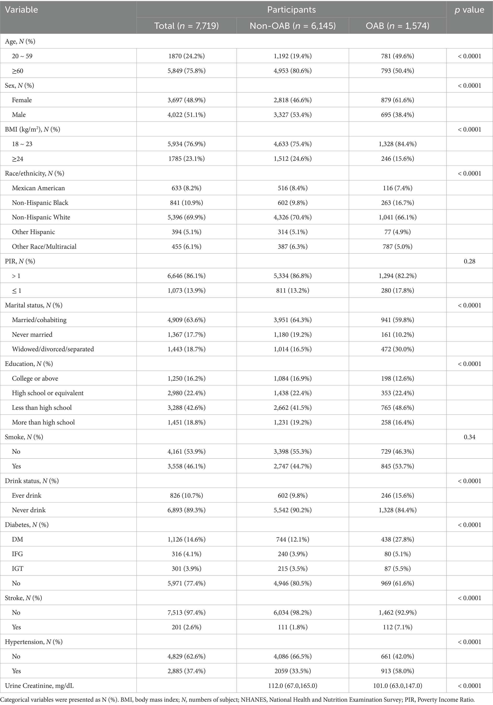 7,719 adults from six NHANES cycles, 1,574 (20.39%) were diagnosed with OAB, while the others were not. Table 1 shows the initial characteristics of participants, differentiating between those with OAB and those without. The groups exhibited significant differences in age, sex, race/ethnicity, education, Poverty Income Ratio, marital status, body mass index, smoking habits, alcohol consumption, diabetes, stroke, hypertension, and urine creatinine distributions.