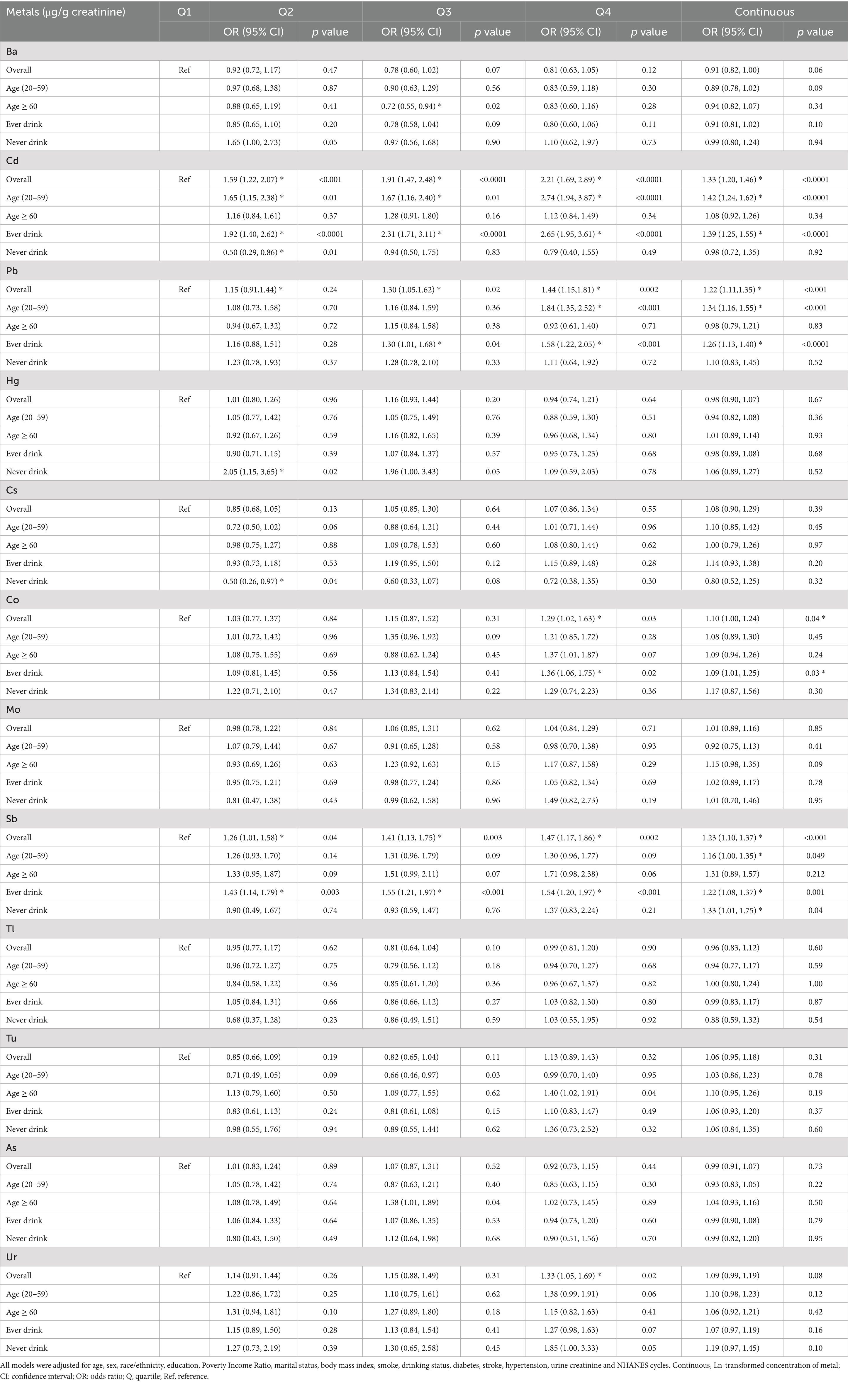 Adjusted multivariate logistic regression analysis considering relevant covariates (Table 2), revealed a substantial elevation in OAB risk for the highest quartile (Q4) of urinary Cd, Pb, Co, Sb, and Ur when compared to the lowest quartile (Q1), with odds ratios (OR) and 95% confidence intervals (CI) as follows: Cd (OR 2.21, 95%CI 1.69–2.89), Pb (OR 1.44, 95%CI 1.15–1.81), Co (OR 1.29 95%CI 1.02–1.63), Ur (OR 1.33 95%CI 1.05–1.69), and Sb (OR 1.47 95%CI 1.17–1.86). Each unit increase in Ln-Cd, Ln-Pb, Ln-Co, and Ln-Sb corresponded to a 33, 22, 10, and 23% rise in OAB risk, respectively, with all p-values being less than 0.05. Additionally, a subgroup analysis was performed considering age and alcohol consumption (Table 2). The study identified a notable rise in OAB risk in the highest quartile (Q4) compared to the lowest quartile (Q1) of Cd (OR 2.74, 95% CI 1.94–3.87) and Pb (OR 1.84, 95% CI 1.35–2.52) among young and middle-aged individuals. The associations persisted as significant when analyzing Ln-transformed metal concentrations and OAB risk, with all p-values remaining below 0.05. In the ever-drinkers group, the risk of OAB was notably higher in the top quartile (Q4) compared to the bottom quartile (Q1) for urinary Cd with an odds ratio (OR) of 2.65 (95% confidence interval [CI]: 1.95–3.61), Pb with an OR of 1.58 (95% CI: 1.22–2.05), and Co with an OR of 1.36 (95% CI: 1.06–1.75). These associations maintained statistical significance even after considering the natural Ln-transformation of metal concentrations and the risk of OAB (all p-values < 0.05). In the older adult group, a strong positive relationship exists between OAB and urinary Ba was observed only in the third exposure quantile (Q3) (OR 0.72, 95% CI 0.55–0.94), with no correlation detected in the highest exposure quantile (Q4). Additionally, there were no significant correlations between other metals and OAB. In the never-drinkers group, there was a notable rise in OAB risk in the second quartile (Q2) of urinary cadmium (Cd) (OR 0.50, 95% CI 0.29–0.86) and Hg (OR 2.05, 95% CI 1.15–3.65), but this increase was not observed in the fourth quartile (Q4). No notable correlations were identified between other metals and OAB.