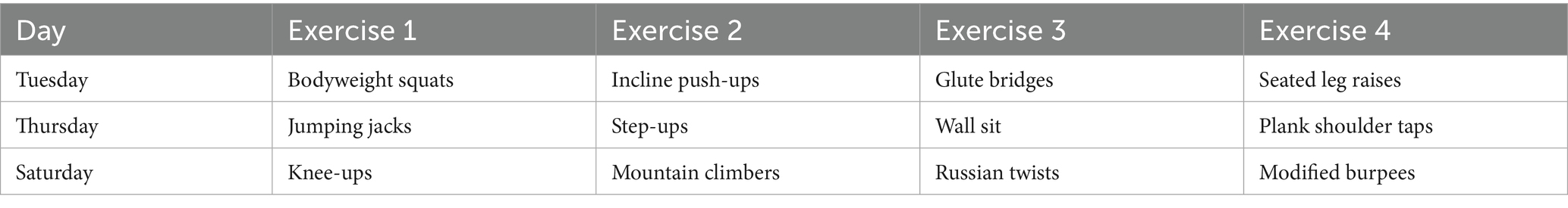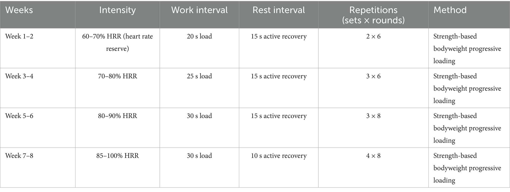 The training program consisted of 8 weeks of high-intensity interval resistance training (HIIRT) specifically tailored for women aged 18–30 years. The program included bodyweight exercises to improve muscular endurance, strength and metabolic function while minimizing the risk of injury. The training sessions were performed three times a week (Tuesday–Thursday–Saturday) with moderate to high intensity and a progressive loading approach. Progressive overload was implemented by increasing work interval duration, reducing rest intervals, and adding exercise variations with higher difficulty levels across the 8-week program. Participants were required to attend at least 80% of the scheduled sessions (minimum 20 out of 24 sessions) to be considered compliant with the intervention protocol. If a session was missed due to illness or personal reasons, make-up sessions were offered when feasible. In this study, no participants missed more than two sessions, and all met the attendance criteria.