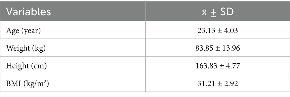 A total of 30 sedentary women aged 18–30 years (mean age: 23.13 ± 4.03 years, mean BMI: 31.21 ± 2.92 kg/m2) voluntarily participated in this study. Inclusion criteria were: (1) being classified as overweight or obese (BMI ≥ 25 kg/m2), (2) not engaging in regular physical activity (less than 150 min of moderate exercise per week), and (3) having no known cardiovascular, metabolic, or musculoskeletal disorders. Also participants’ physical activity level prior to enrollment was assessed through a structured interview during screening. Participants reported their average weekly frequency and duration of moderate to vigorous physical activity. Those reporting less than 150 min per week were classified as sedentary and eligible for the study (1).