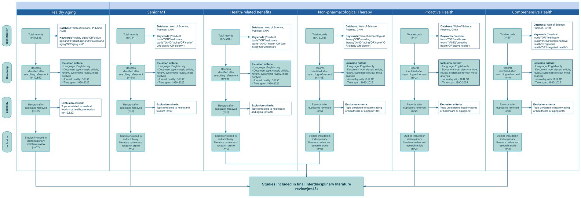 The literature search process began with the identification of articles related to healthy aging using keywords such as “healthy aging,” “positive aging,” “active aging,” “robust aging,” “successful aging,” and “aging well.” This initial search yielded 57,535 articles, of which 12,852 met the predefined inclusion criteria. Among the interdisciplinary studies identified, only 16 were found to be relevant to tourism, healthcare, and medicine, with 13 specifically addressing MT. Using a combination of keywords (“MT*”) or (“healthcare tourism*”) along with (“elderly” or “older adults” or “senior” or “aging”), 744 publications were retrieved, from which 78 papers were selected. However, most of these articles focused on MT for general tourists in the fields of medical and cosmetic procedures, with only nine mentioning population aging. None of these addressed health-related retirement issues. An additional search using the keywords (“MT*”) or (“healthcare tourism*”) combined with (“health” or “well-being” or “wellness”) resulted in 3,215 files, of which 538 were retained. These studies primarily centered on general tourists and residents, with only nine articles touching upon health, care, and aging. None explored the role of MT in promoting healthy aging. A further search using the keywords (“MT*”) or (“healthcare tourism*”) combined with (“comprehensive health” or “general health” or “integrated health”) yielded 80 articles, of which eight were retained. However, these studies focused on the broader context of the health industry, targeting the general population rather than older adults, aging, or healthy aging. Using the keywords (“MT*”) or (“healthcare tourism*”) combined with (“proactive health” or “active health”), 14 relevant articles were identified, but only two met the screening criteria. Unfortunately, these two articles focused on public health in India and did not address health-related retirement issues. Finally, a search using the keywords (“NPT”) or (“non-drug therapy”) combined with (“elderly” or “older adults” or “senior” or “aging”) retrieved 75,088 articles, of which 145 met the inclusion criteria. Among these, only two studies mentioned health-related retirement, two focused on mental health aspects of geriatric depression, and one addressed cognitive disorders in older adults. Based on the above literature search and screening process, this study ultimately included 48 articles for an in-depth review.