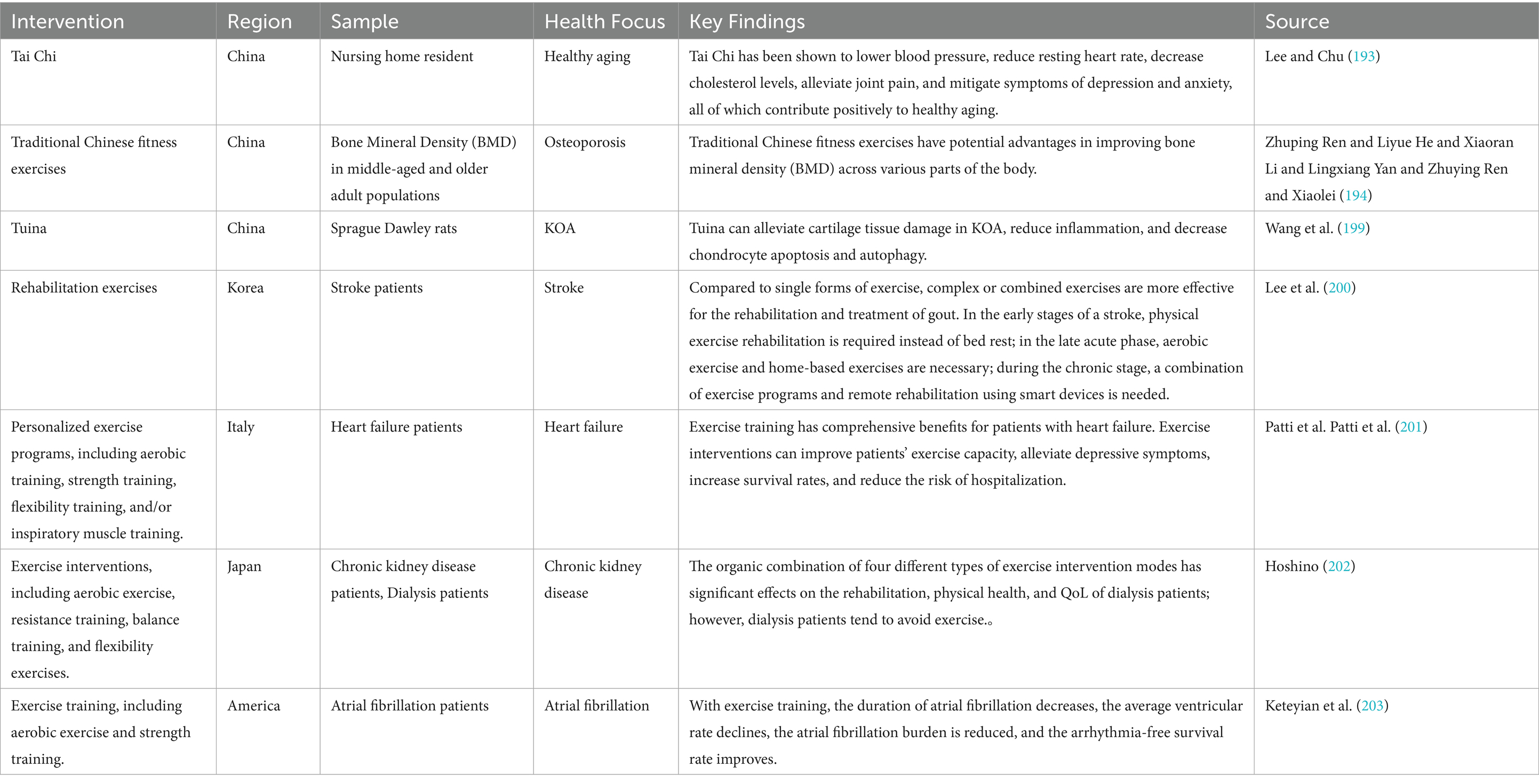 Research demonstrates that various traditional and modern exercise interventions play a significant role in promoting healthy aging. For example, Linda Yin-King Lee and Eric Chun-Pu Chu found that tai chi not only enhances muscle strength and balance but also alleviates stress and improves mood, offering both physiological and psychological benefits. Its gentle, safe, easy-to-learn, and cost-effective nature makes it particularly suitable for older adults, including residents in care facilities (193). Meanwhile, aging is often accompanied by deteriorating bone health and an increased risk of osteoporosis. Zhuping et al. (194) conducted a systematic analysis and ranking of bone-related studies, comparing the effectiveness of different exercises. They proved that traditional Chinese fitness practices such as tai chi, baduanjin (eight pieces of brocade), yijinjing (sinew Metamorphosis), and wuqinxi (195) significantly improve physical and bone health, effectively preventing osteoporosis (196–198). Furthermore, Wang et al. established a rat model of knee osteoarthritis (KOA) and found that tuina (Chinese therapeutic massage) significantly improved outcomes in KOA rats by regulating chondrocyte apoptosis and autophagy, inhibiting inflammatory cytokine secretion, alleviating inflammation, and promoting cartilage repair (199). This highlights the importance of tuina as a NPT in the prevention and treatment of knee osteoarthritis. Furthermore, by dynamically analyzing data such as gait stability and joint mobility collected from wearable devices (e.g., inertial sensors, foot pressure pads) using continual learning algorithms, rehabilitation plans can be optimized in real time. For example, when the algorithm detects a significant improvement in gait coordination in older adult patients during hot spring therapy, it will automatically recommend extending the aquatic exercise program or switching to mountain hiking therapy; Conversely, if balance ability fluctuates, the exercise intensity is promptly reduced and the frequency of traditional Chinese massage is increased. This dynamic adjustment mechanism based on incremental learning avoids the “catastrophic forgetting” caused by data updates in traditional models, significantly enhancing the precision and timeliness of rehabilitation interventions. Kyung Eun Lee et al., using the PRISMA standard for systematic reviews and meta-analyses, analyzed 21 reports on rehabilitation interventions for gout patients. Their findings indicated that aerobic exercise and home-based exercise programs significantly aid in post-stroke rehabilitation, improving patients’ motor abilities and QoL (200). Patti et al. conducted exercise training studies on heart failure patients, showing that cardiac rehabilitation not only enhances patients’ exercise capacity and QoL but also effectively reduces depressive symptoms, improves survival rates, and lowers hospitalization risks (201), further confirming the critical role of exercise rehabilitation in chronic cardiovascular disease management. Hoshino pointed out that dialysis patients exhibit significantly lower levels of physical activity compared to the general older population (202). However, tracking dialysis patients who underwent exercise interventions revealed that exercise significantly improves their physical capabilities and QoL, which are two core components of renal rehabilitation. Lastly, Keteyian et al. systematically reviewed exercise testing and rehabilitation data for atrial fibrillation patients, finding that exercise rehabilitation not only enhances patients’ exercise capacity and QoL but may also alleviate atrial fibrillation-related symptoms (203). These studies collectively demonstrate that both traditional Chinese fitness practices and modern exercise interventions have significant effects in promoting healthy aging. These interventions not only improve physical function in older adults but also enhance mental health and social engagement, providing important practical pathways toward comprehensive healthy aging (see Table 1).