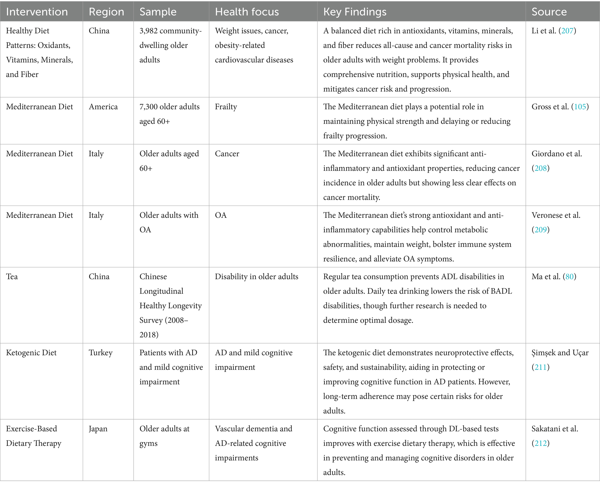 For example, Li et al. conducted a questionnaire survey of 3,982 older adults in Chinese communities and calculated their dietary quality index, finding that higher dietary quality significantly reduced the risk of all-cause mortality and cancer-related mortality associated with underweight or obesity in older adults (207). Additionally, anti-inflammatory and antioxidant diets have been shown to play an important role in preventing cardiovascular disease mortality related to obesity (207). Gross et al. studied 7,300 eligible older adults to evaluate the relationship between frailty status and adherence to the Mediterranean diet, with results indicating that the Mediterranean diet significantly reduces frailty in older adults (105). It is worth noting that the continuous learning algorithm can deeply integrate local dietary databases with patients’ personalized needs. For example, during MT in Thailand, the algorithm analyzes real-time blood glucose monitoring data and dietary logs to dynamically learn patients’ metabolic responses to tropical fruits, generating adaptive recipes: recommending low-GI local fruits (such as pomelo instead of mango) paired with high-fiber palm heart salad, preserving regional dietary characteristics while ensuring stable blood glucose levels. The algorithm employs an incremental training mechanism to continuously integrate ingredient characteristics from different wellness destinations and patient feedback, gradually building a cross-cultural nutritional intervention knowledge base. Giordano et al., through a systematic review of literature and data analysis, found that the Mediterranean diet effectively lowers the incidence of geriatric cancers, though its specific impact on cancer mortality requires further investigation (208). Veronese et al. pointed out that due to its rich nutrients and bioactive compounds, the Mediterranean diet is an effective method for preventing and managing osteoarthritis, promoting rehabilitation, or preventing disease progression (209). Furthermore, Ma et al. analyzed the relationship between activities of daily living (ADL) and basic activities of daily living (Ma et al.) in older adults and their tea-drinking habits using data from the 2008–2018 Chinese Longitudinal Healthy Longevity Survey, showing that tea consumption has a protective effect against disability in older adults (210). Şimşek and Uçar, through a systematic review of literature, explored the application of the ketogenic diet in Alzheimer’s disease (AD) or mild cognitive impairment, demonstrating that the ketogenic diet effectively protects or improves cognitive function in older adults (211). Lastly, Sakatani et al. developed a cognitive function screening test based on deep neural networks and evaluated older adults in gyms, revealing that therapy combining exercise and diet significantly improves cognitive function in older adults (212). These studies highlight the significant role of proper dietary structure and lifestyle interventions in promoting the health of older adults, preventing chronic diseases, and improving cognitive function. By optimizing dietary quality, adhering to the Mediterranean diet pattern, integrating exercise and nutritional therapies, and exploring personalized dietary solutions such as the ketogenic diet, it is possible to effectively enhance the QoL and overall health of older adults (see Table 2).