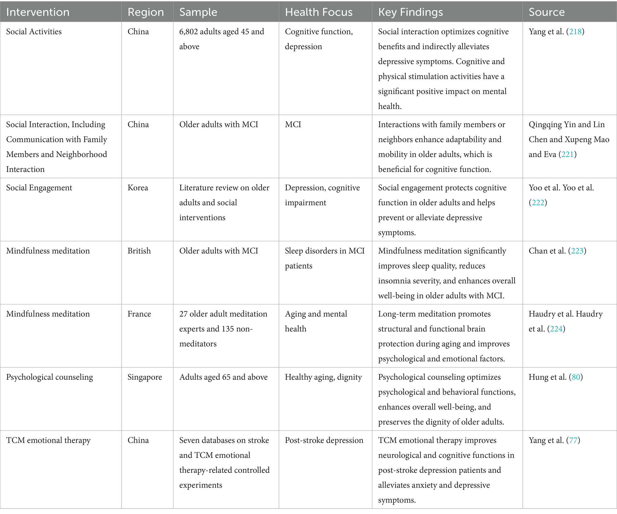 For example, Yang et al. conducted a data modeling analysis to examine the relationship between social activities, depression, and cognitive function in older adults. The study found that social activities can effectively reduce depressive symptoms by strengthening social connections and providing emotional support. Furthermore, cognitive health interventions not only help protect cognitive function in older adults but also play an important role in preventing and alleviating depression, thereby promoting healthy aging (218). Yin et al. employed a phenomenological approach to conduct an in-depth study of older adults with mild cognitive impairment (MCI). The results showed that participants who sought help from family members and maintained neighborhood social ties not only expanded their mobility within the community but, in some cases, extended it beyond community boundaries. This increased mobility had a positive impact on the rehabilitation of cognitive impairments (221). Notably, during MT, social interactions with family members or strangers can also protect cognitive function by expanding mobility. Soo Yeon Yoo et al. performed a systematic search and detailed analysis of relevant literature, finding that as the frequency of social interactions increases along with significant improvements in cognitive function, the level of depression in older adults decreases significantly (222). Chan et al. conducted a systematic review of six databases, highlighting that mindfulness therapy, as a low-cost and scalable psychological intervention, can be easily integrated into caregiving practices, significantly enhancing the well-being of older adults with MCI and improving their sleep quality (223). Haudry et al. assessed 27 older adult meditation experts and 135 non-meditators, revealing that meditation can reduce negative psychological factors while enhancing positive emotions through specific mechanisms. Additionally, meditation practice can counteract brain volume loss associated with aging, promoting healthier aging processes (224). Hung et al. conducted a survey of older adults receiving care services at “Senior Activity Centers” in Singapore using both qualitative and quantitative research methods. The study demonstrated that psychological counseling not only enhances overall well-being but also effectively boosts dignity among older adults (225). Lastly, Yang et al. conducted a systematic review of database literature and related controlled experiments, finding that TCM-based emotional therapy has significant effects in improving post-stroke depression symptoms. This therapy is advantageous due to its cost-effectiveness, safety, minimal side effects, and ease of acceptance by patients, providing critical support for rehabilitation (77). In conclusion, social activities, psychological interventions, and traditional medicine therapies demonstrate multifaceted potential in promoting mental health and cognitive function in older adults. By strengthening social connections, providing emotional support, and adopting personalized interventions, these approaches not only effectively alleviate depressive symptoms but also offer important support for achieving healthy aging (see Table 3).
