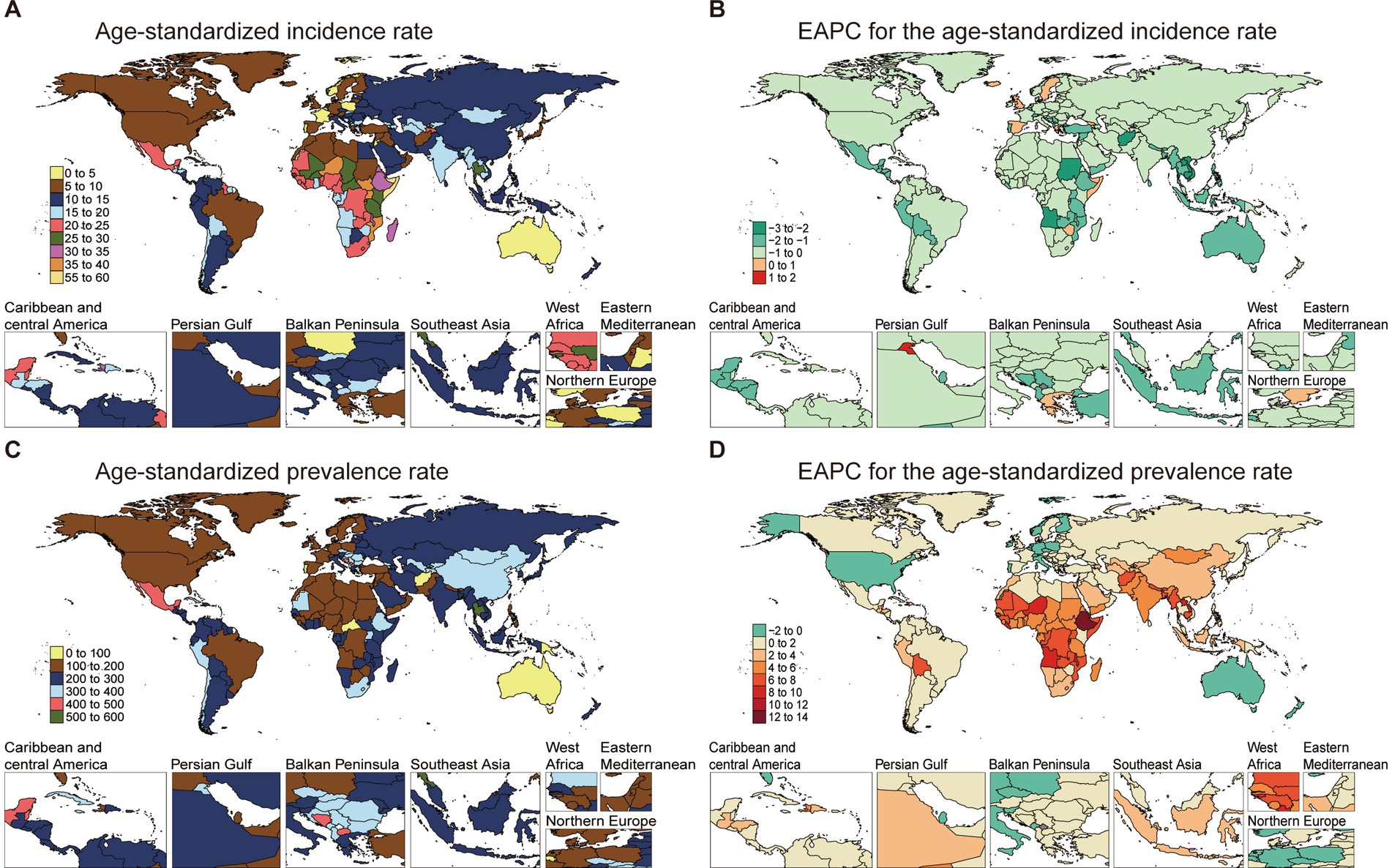 The prevalence rates followed similar regional patterns, with countries like Ethiopia experiencing significant increases in prevalence EAPC (12.25, 95% CI: 11.9 to 12.60). By contrast, Australia showed a declining trend, with an EAPC of −1.04 (95% CI: −1.24 to −0.84). This suggests that the prevalence burden, while widespread, is concentrated in certain regions (Figures 1C,D; Supplementary Table S1).