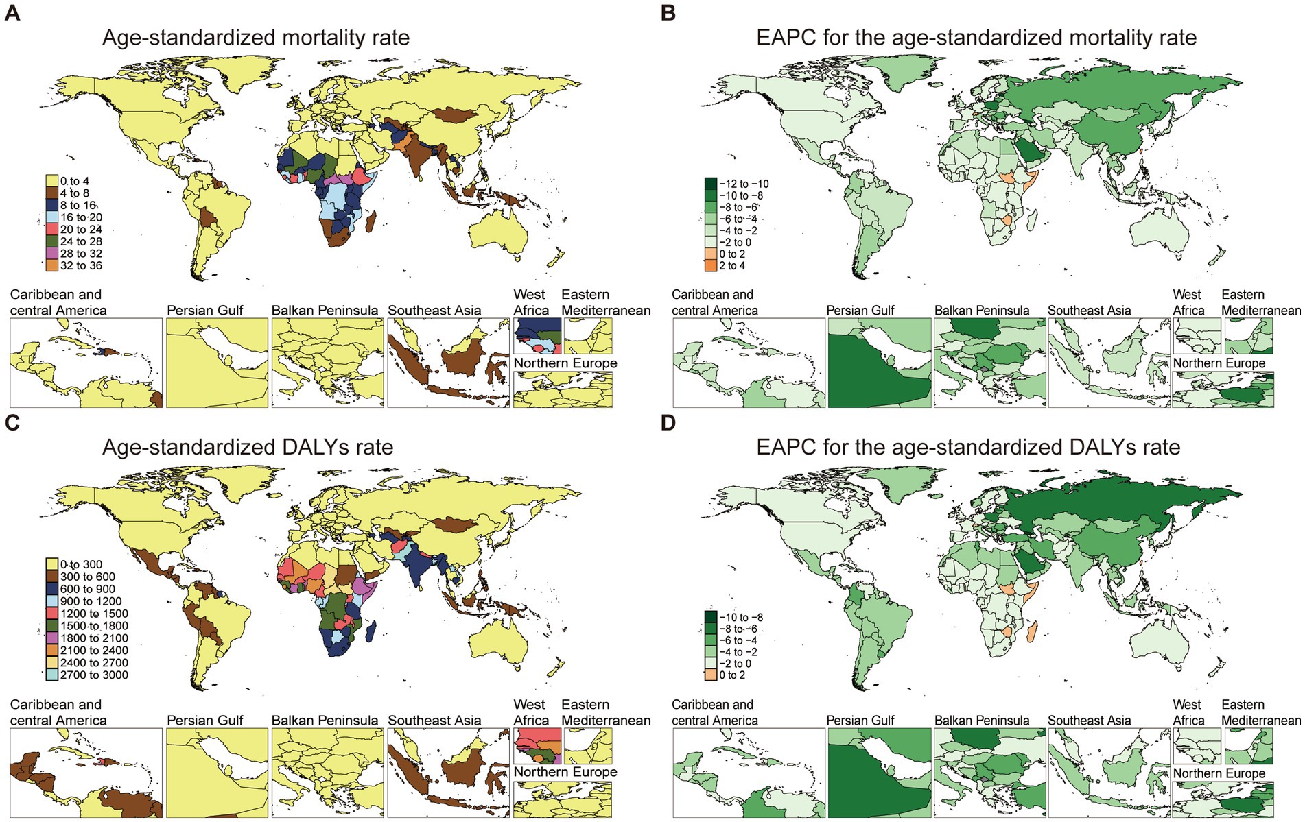 Figure 1. The age-standardized incidence and prevalence rate of NE-BAT in 204 countries and territories. (A) The age-standardized incidence rate of NE-BAT in 2021. (B) The EAPC of age-standardized incidence rate of NE-BAT from 1990 to 2021. (C) The age-standardized prevalence rate of NE-BAT in 2021. (D) The EAPC of age-standardized prevalence rate of NE-BAT from 1990 to 2021. NE-BAT, neonatal encephalopathy due to birth asphyxia and trauma; EAPC, estimated annual percentage change.