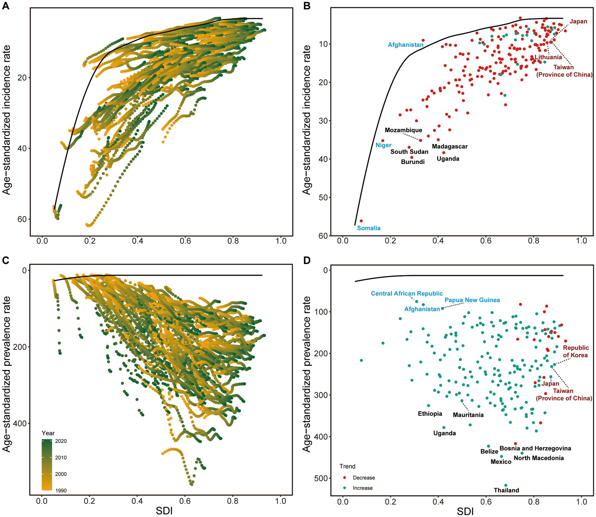 Figure 3. Frontier analysis of NE-BAT based on SDI and incidence and prevalence rate from 1990 to 2021. (A) Frontier analysis of age-standardized NE-BAT incidence rates from 1990 to 2021. (B) Frontier analysis of age-standardized NE-BAT incidence rates in 2021. (C) Frontier analysis of age-standardized NE-BAT prevalence rates from 1990 to 2021. (D) Frontier analysis of age-standardized NE-BAT prevalence rates in 2021. (A,C) Color scale represents the years from 1990 depicted in yellow to 2016 depicted in green. The frontier is delineated in solid black color. (B,D) The frontier is delineated in solid black color; countries and territories are represented as dots. Examples of frontier countries with low SDI (<0.5) and low effective difference are labeled in blue, and examples of countries and territories with high SDI (>0.85) and relatively high effective difference for their level of development are labeled in red. Red dots indicate an increase in age-standardized rate from 1990 to 2021; blue dots indicate a decrease in age-standardized rate from 1990 to 2021. NE-BAT, neonatal encephalopathy due to birth asphyxia and trauma; SDI, socio-demographic index.