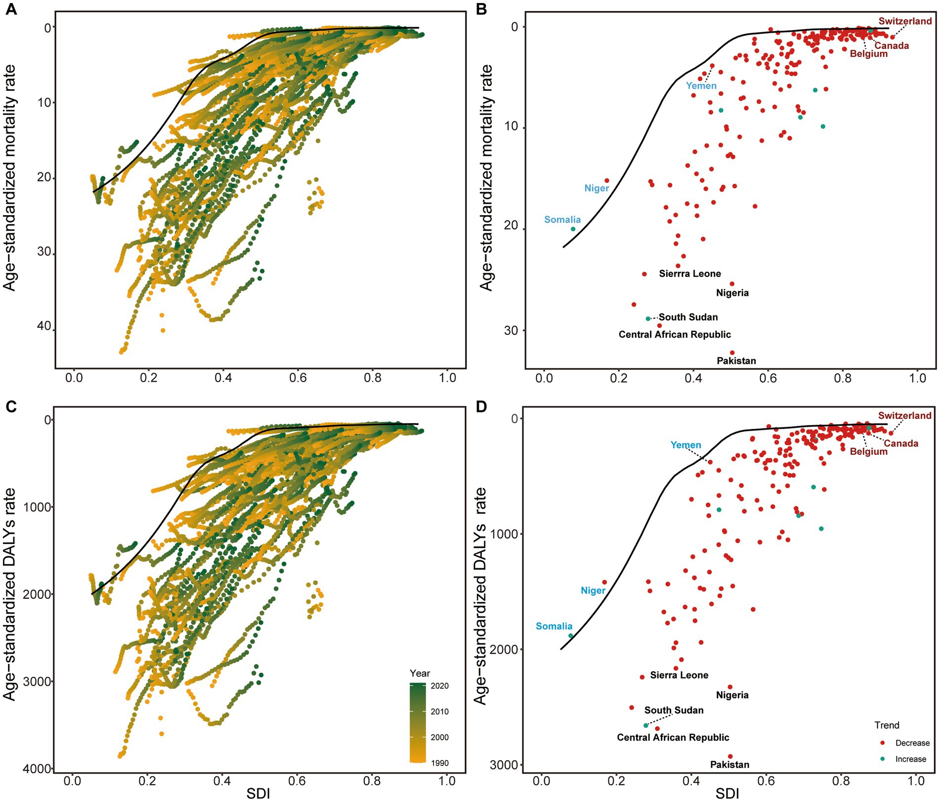 Mortality rates demonstrated similar patterns of general decline across SDI levels (Figure 4A). Somalia, Niger, and Yemen achieved the best performance in mortality reduction among low SDI countries and territories, while Canada, Belgium, and Switzerland showed the poorest outcomes among high SDI countries and territories (Figure 4B). DALYs patterns closely paralleled mortality trends (Figure 4C), with Niger, Yemen, and Somalia representing the best-performing low SDI countries and territories, and the same high SDI countries and territories (Canada, Belgium, and Switzerland) showing suboptimal performance (Figure 4D). These findings highlight both the potential for improvement in high-resource settings and the successful strategies implemented by certain low-resource countries that could serve as models for similar contexts.